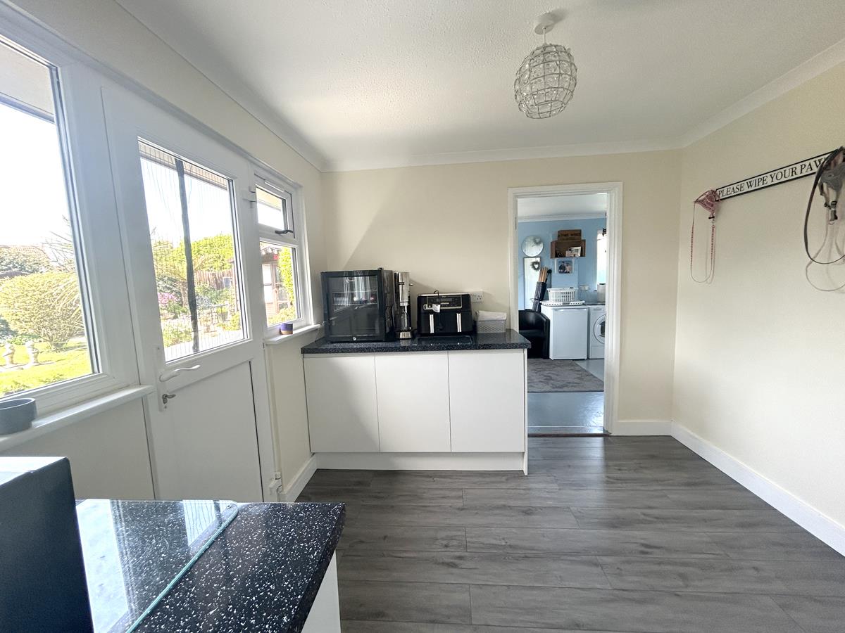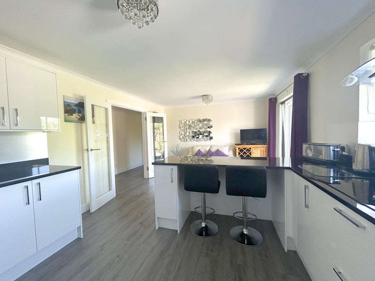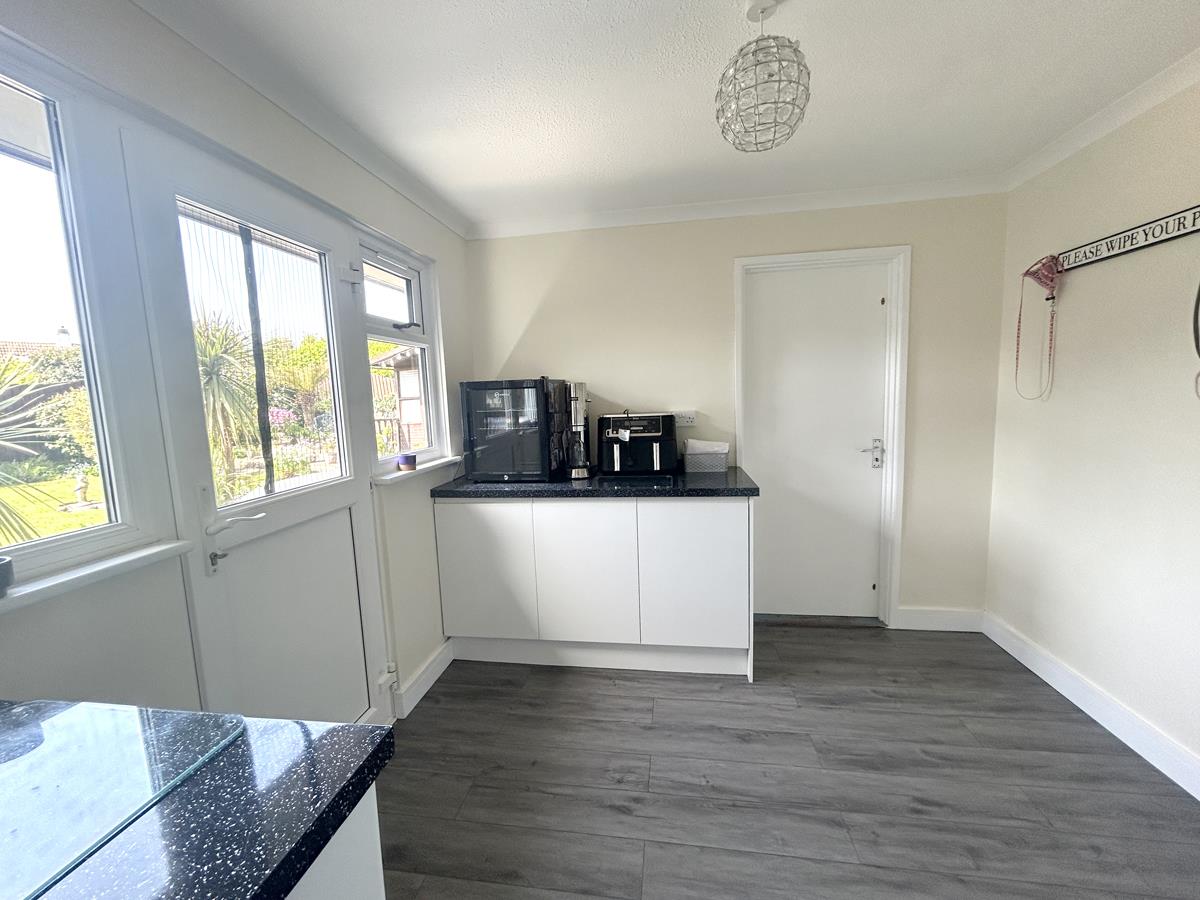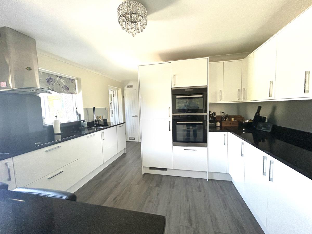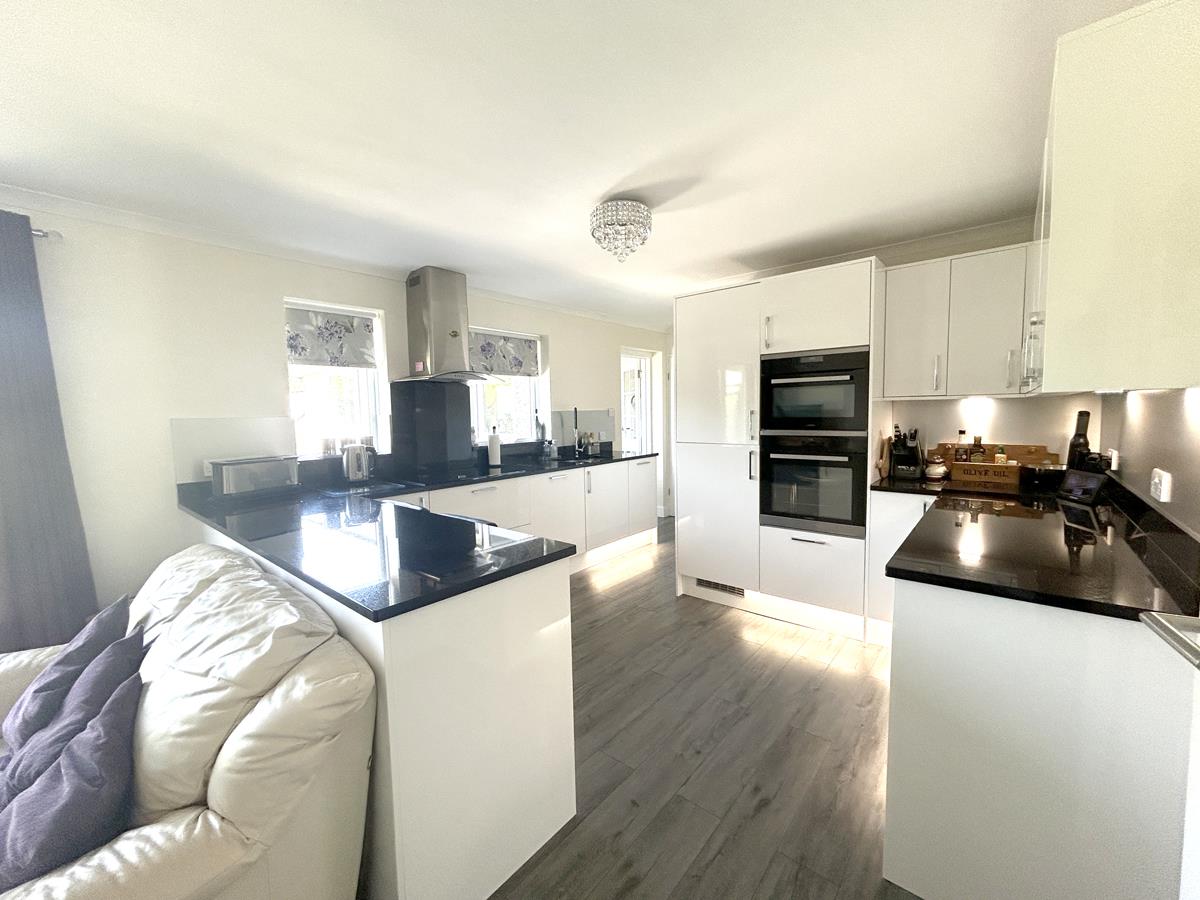 A full suite of integrated appliances includes an oven, combination microwave oven, dishwasher, and fridge freezer. The space is further enhanced by wood-effect flooring and an abundance of natural light, with windows to both the front and rear aspects with matching granite sills, along with a glazed sliding patio door and matching side panel that open onto the garden.