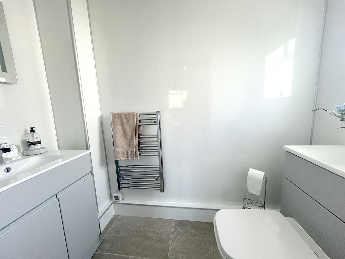 En Suite - Being newly appointed with sink unit set into a vanity style unit with storage under, wall mirror over, dual flush W.C. with concealed cistern, easy clean walls, ladder style towel drying radiator and obscured glazed window to the side aspect.