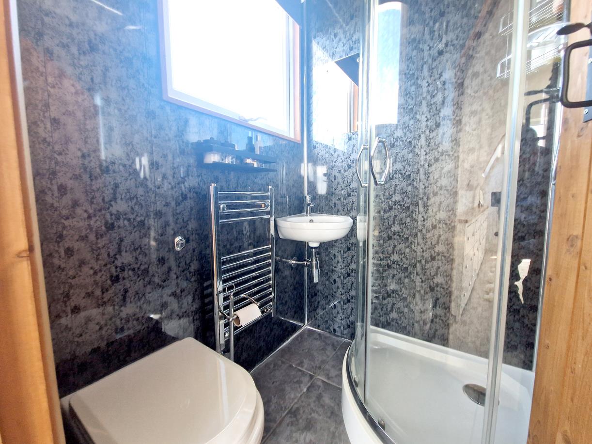 Shower Room - Comprising a large walk in shower cubicle with both rain and flexible shower heads, wash basin with mixer tap over and cupboards under and a heated towel rail. There are tiled walls and an obscured window to the side.