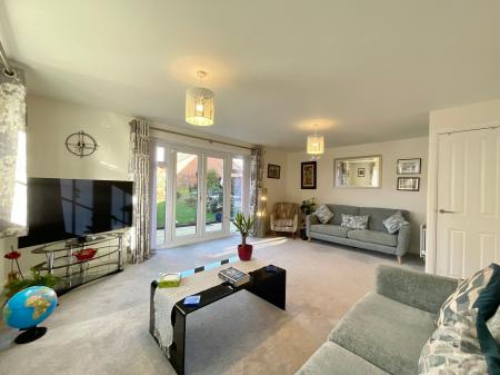 - Bright and airy living room featuring French doors leading directly to the garden.