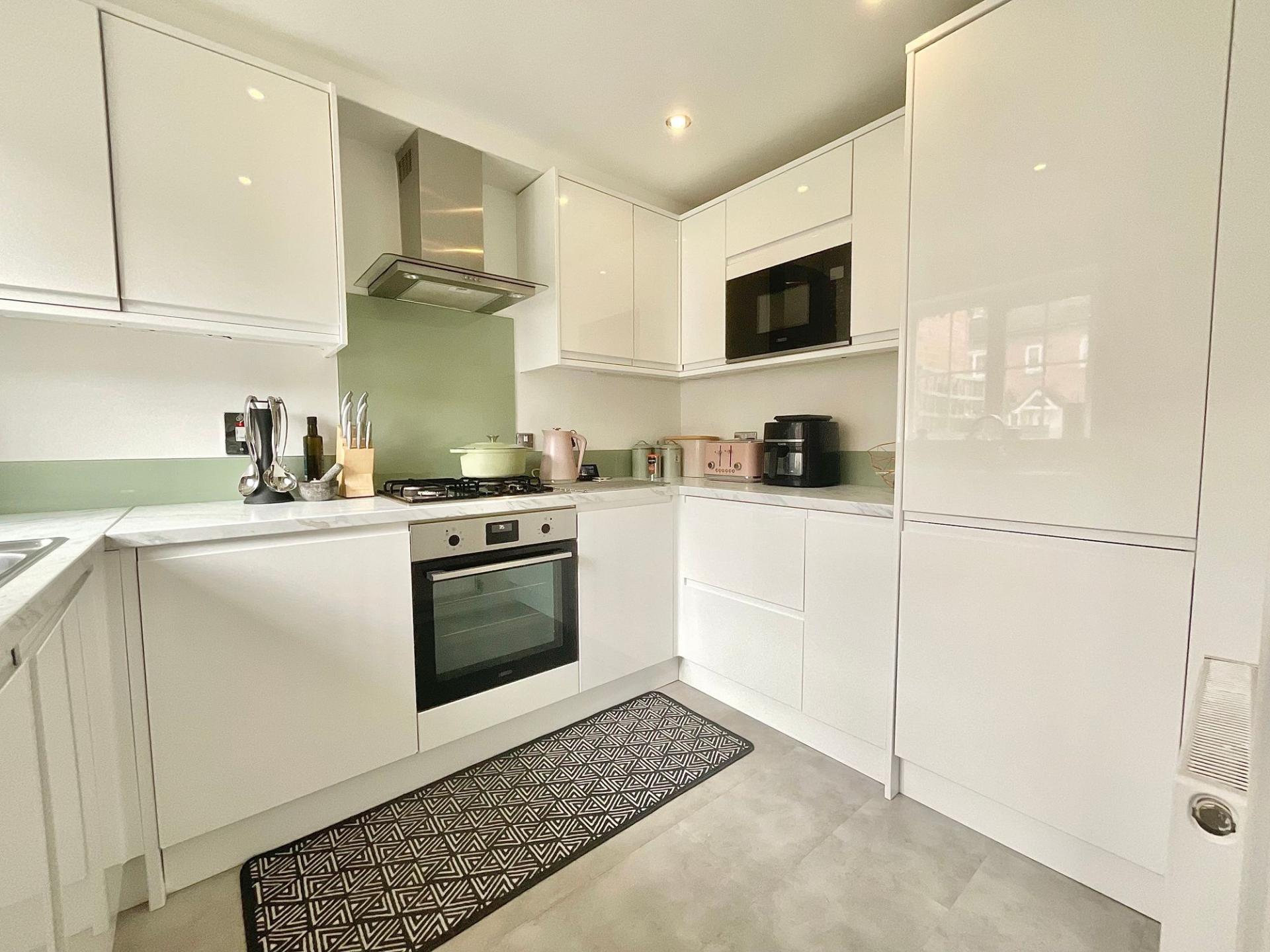 - Modern kitchen – Finished in a sleek white design with integrated appliances, generous storage, and plenty of counter space.