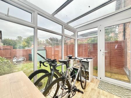 - Spacious living areas – A large living room with space for both relaxation and a home office setup, opening via French doors into a bright conservatory with views of the garden.