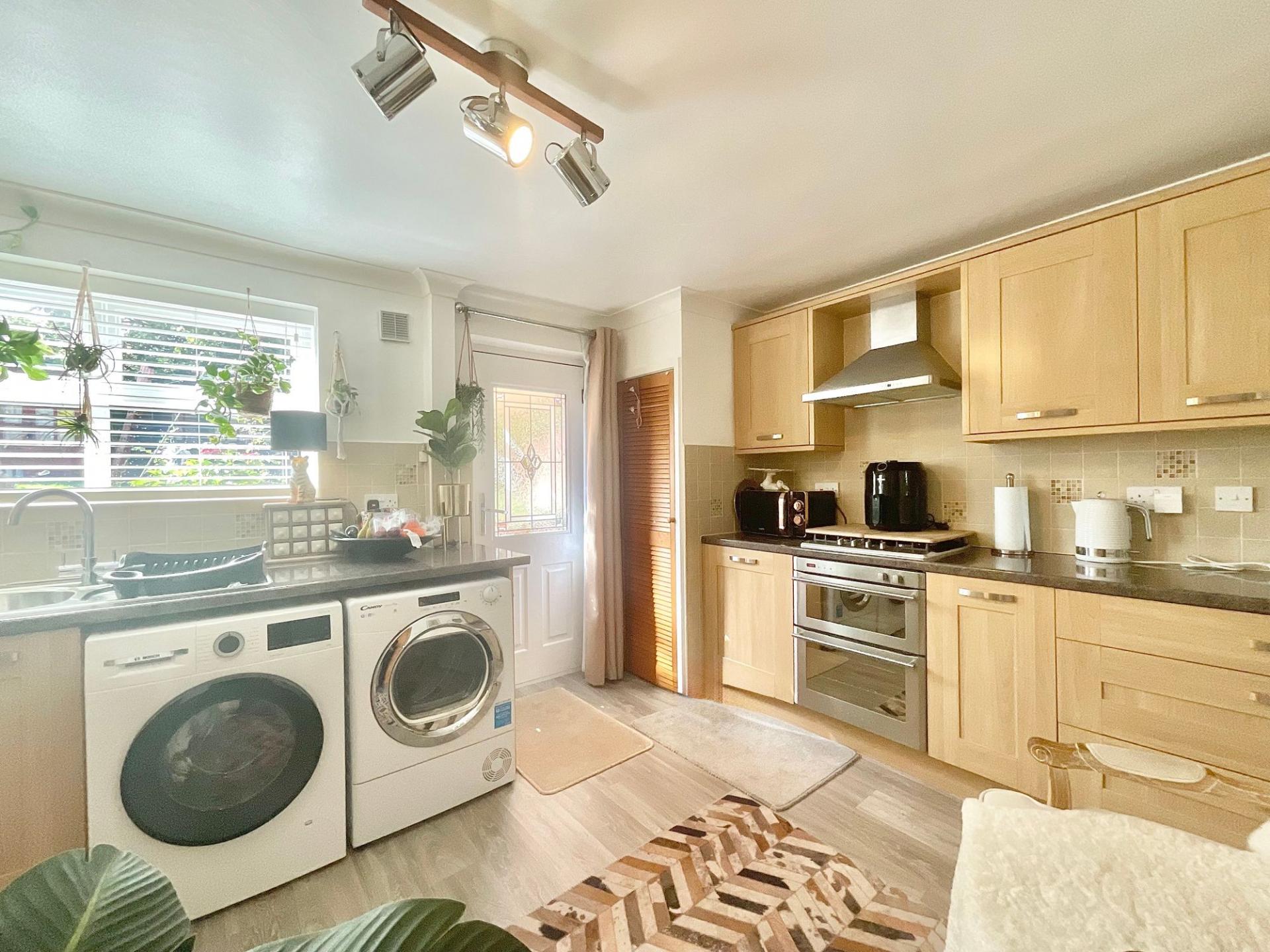- Well-Equipped Kitchen – Includes integrated appliances, ample storage, and space for both a washing machine and dryer.