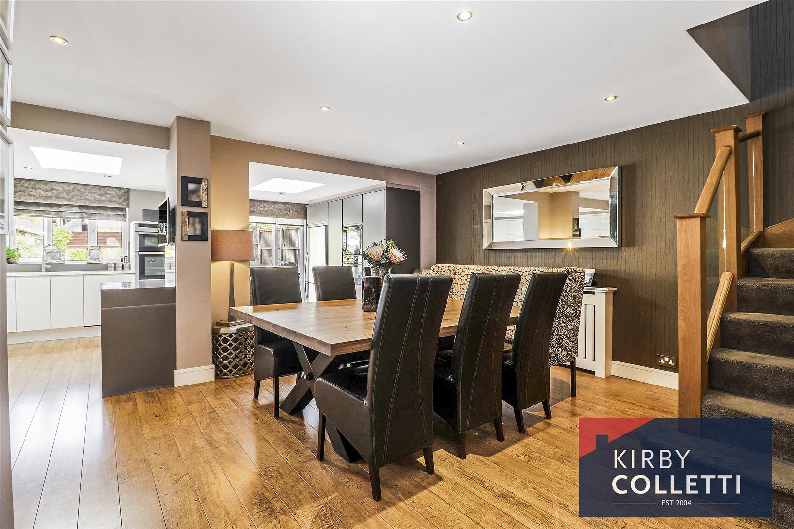 Dining Area - 5.82m max x 4.47m (19'1 max x 14'8) - Recessed ceilingh spotlights. Laminated wood flooring. Cupboard with plumbing for washing machine and space for tumble dryer. Stairs up tom first floor with galss ballustrade. Open to: