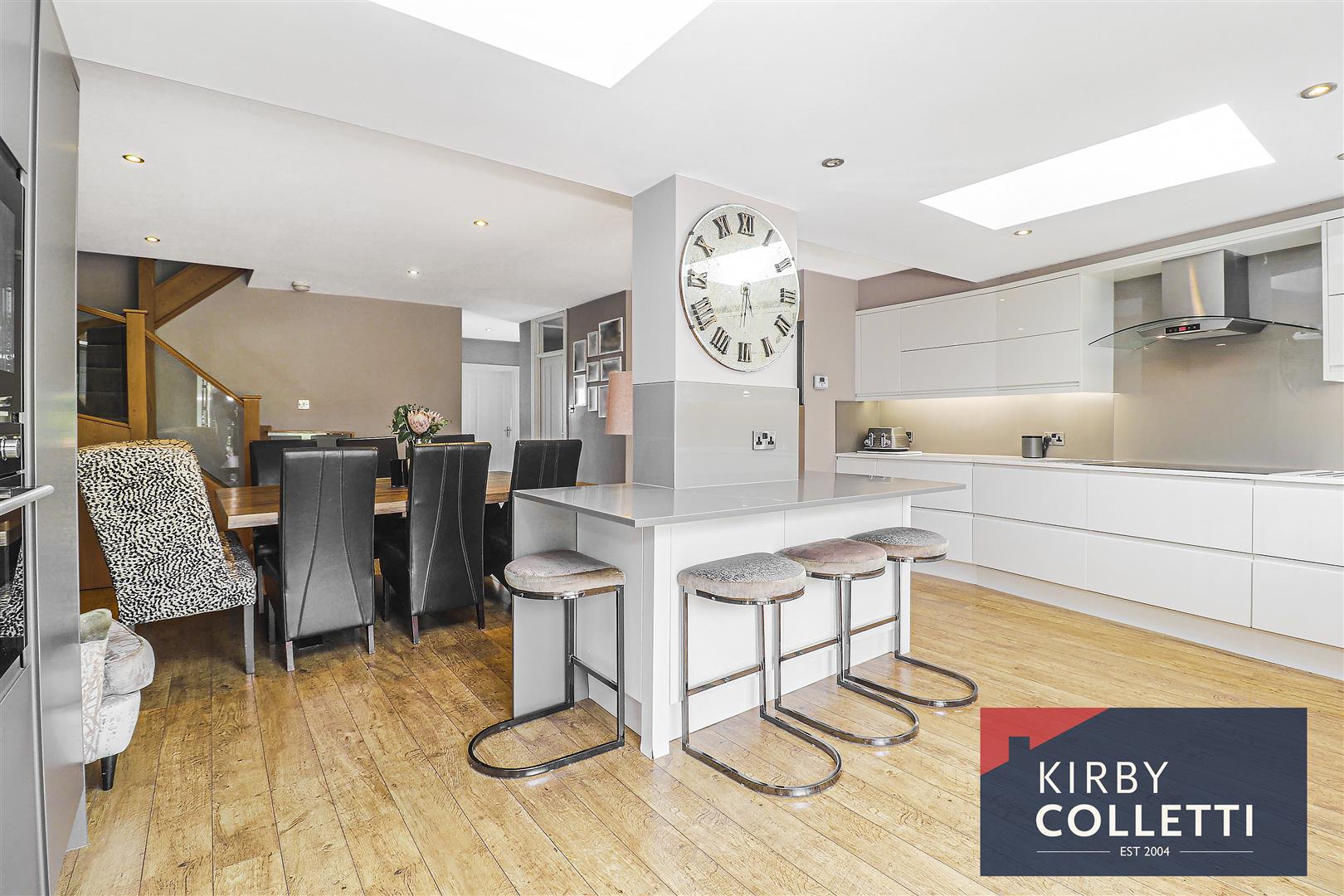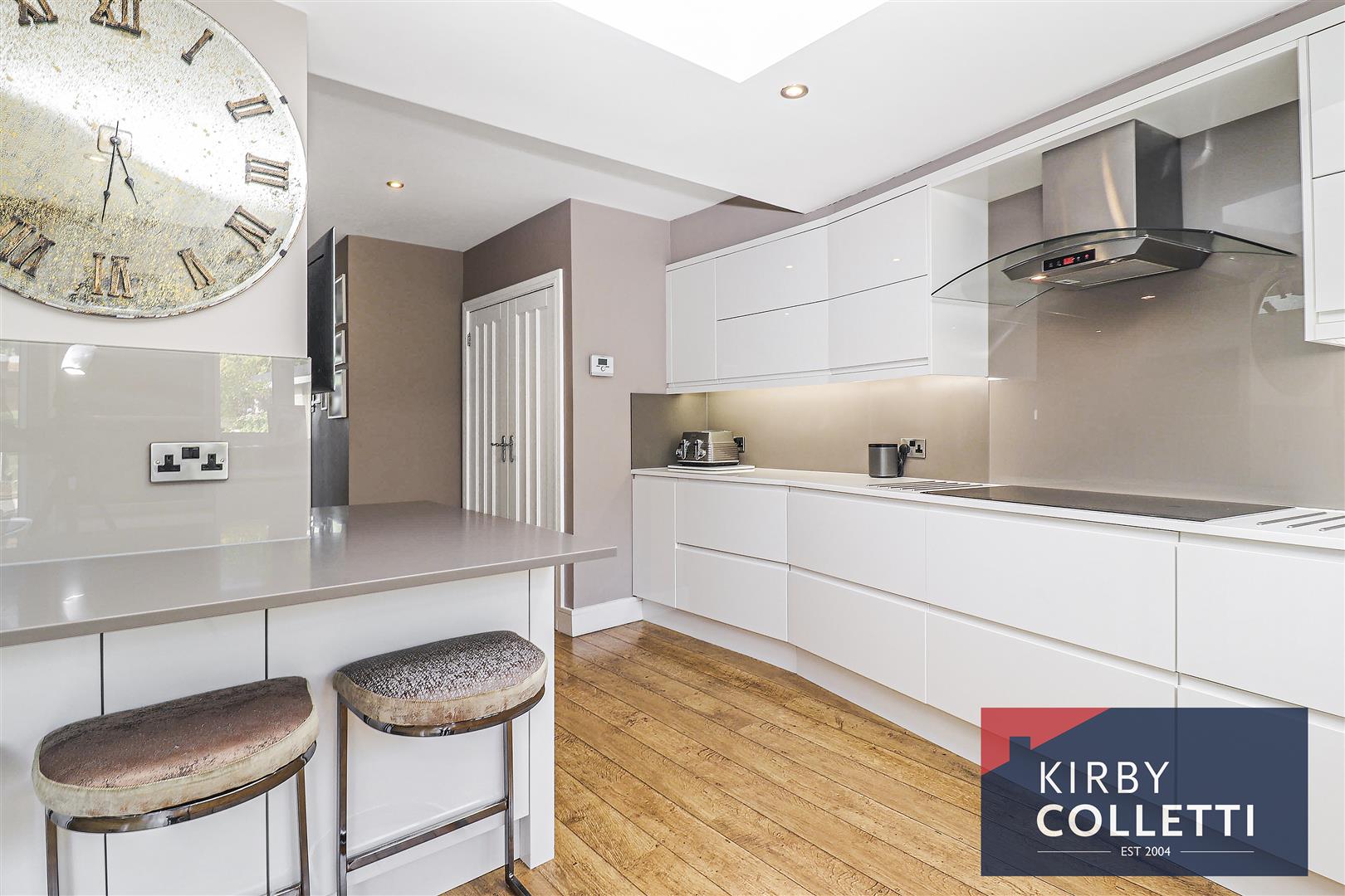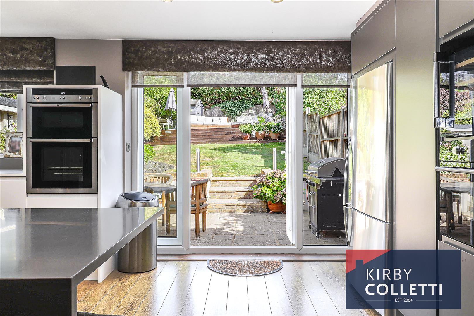 Quality Fitted Kitchen - 5.82m max x 3.05m (19'1 max x 10) - Rear aspect uPVC double glazed windows and double doors to rear garden. Range of contemporary wall and base unit including deep pan drawers with Corian worktops over and inset sink unit with QOOKER tap. Breakfast bar. SIEMENS Induction hob. Built in electric oven. Built in microwave. Integrated dishwasher. Wine cooler. Space for fridge/freezer. Laminated wood flooring.
