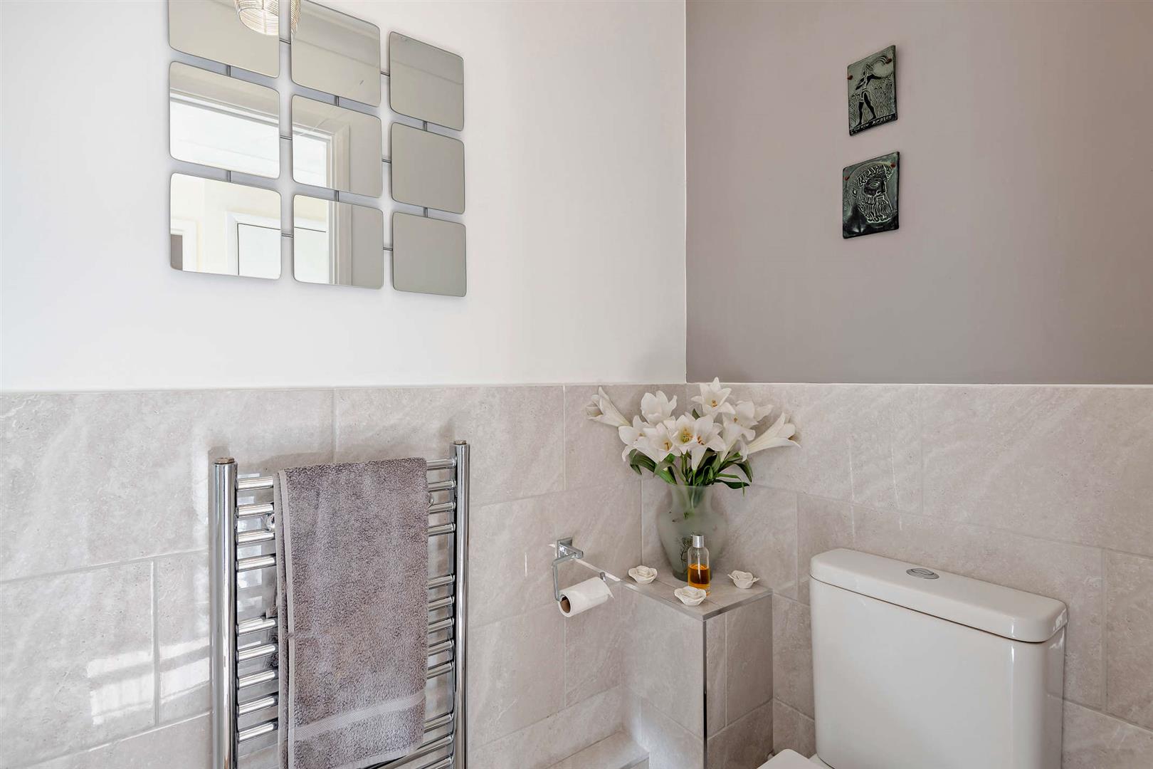 Cloakroom - Wash hand basin in vanity unit with cupboards under. Low level WC. Chrome heated towel rail. Half tiled walls.