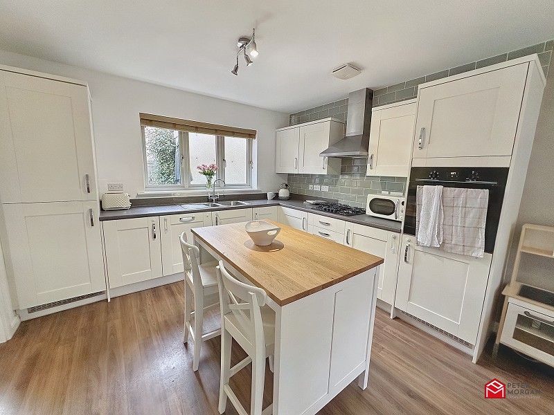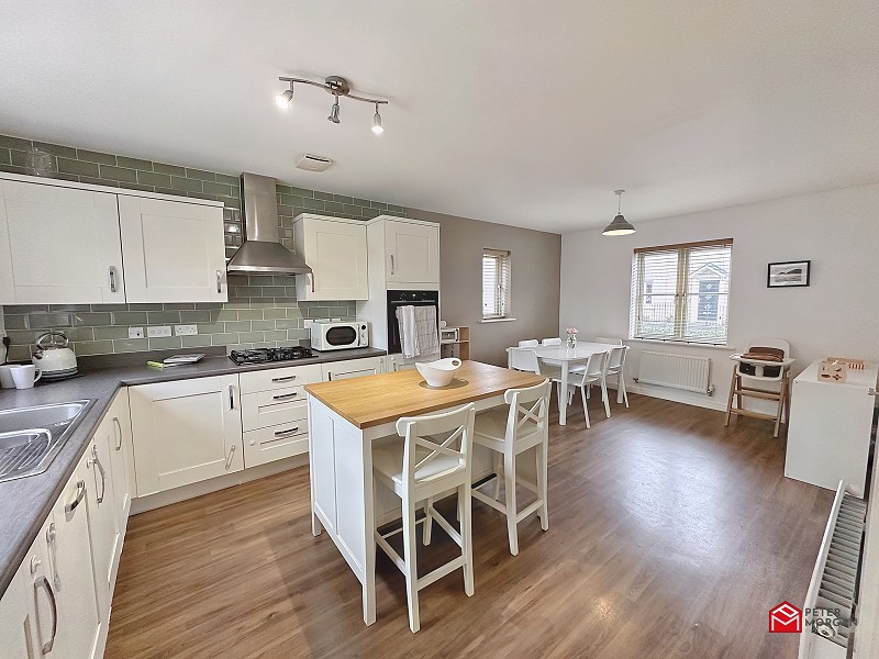 A modern family kitchen appointed with a range of matching shaker style wall and base units with work tops over and an inset stainless steel sink with mixer tap. Wooden double glazed window to the rear, front and side aspect, gas hob with fan over, integrated cooker, integrated fridge freezer, integrated dishwasher, vinyl flooring and two radiators.