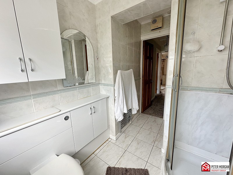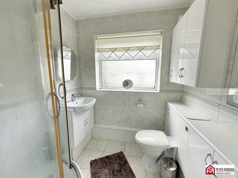 uPVC frosted window to rear. Fully tiled walls. Tiled floor. 3 piece suite comprising WC with cupboard surround, wash hand basin set in vanity unit, wall hung storage cupboard. Shower cubicle. Towel radiator. Airing cupboard with shelving and hot water tank to heat water only.