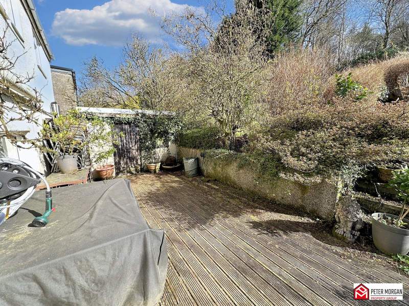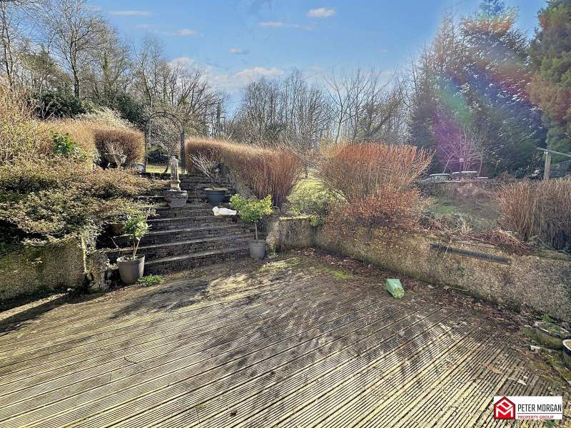Decking area with steps leading to further spacious laid to lawn grounds surrounded with matured shrubs and outhouses.