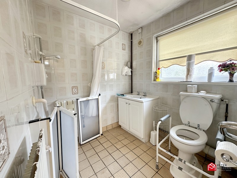 Comprising of a low level WC, wash hand basin and shower area. uPVC window to the rear aspect, radiator and fully tiled walls.