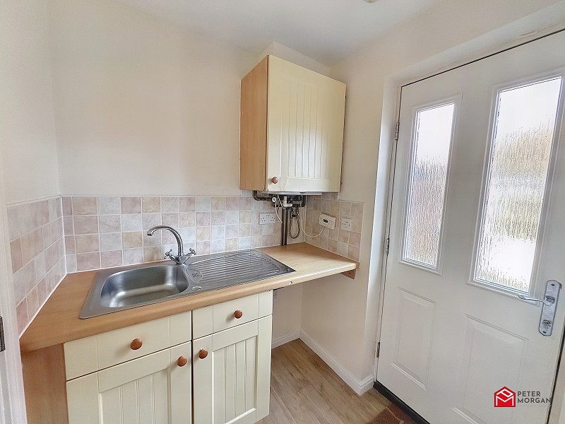 Appointed with a range of matching wall and base units with work top and stainless steel sink. Laminate flooring, part tiled walls, plumbing in place for a washing machine, radiator and door to access the rear garden.