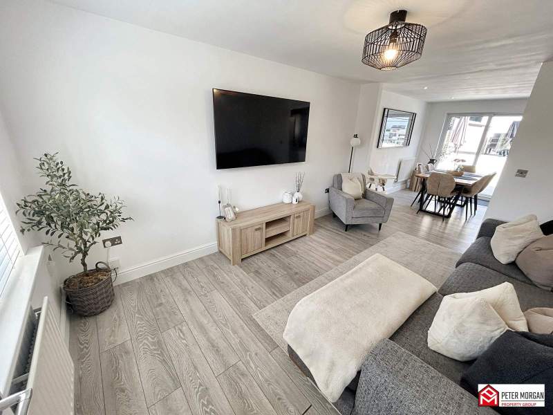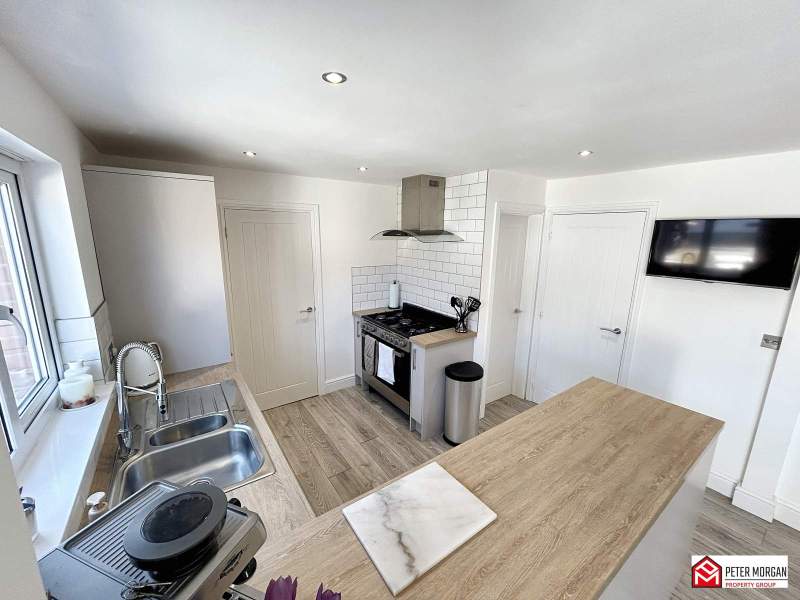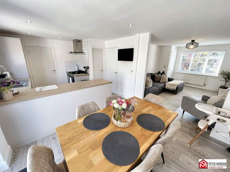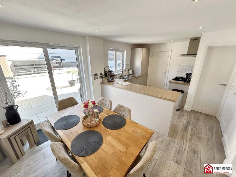 Open plan kitchen appointed with a range of matching wall and base units with wood-effect work tops over and inset stainless steel sink with mixer tap. uPVC double glazed window to rear aspect, space for range cooker, integrated fridge freezer, integrated dishwasher, wood-effect flooring and French doors to access rear garden.