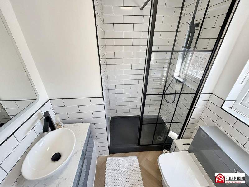 Comprising of a low level WC, wash hand basin and shower cubicle with mains shower and waterfall attachment. uPVC window to front aspect, extractor fan and herringbone wood effect flooring.