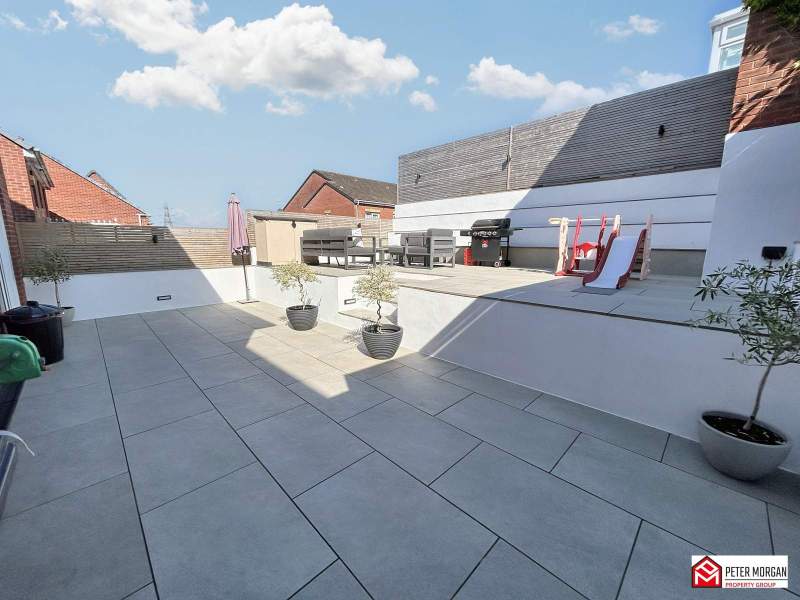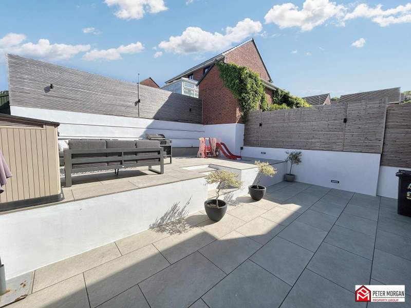 The outdoor area is well-maintained and offers off-road parking as well as additional outdoor living space to rear. The extended patio features easy access from the kitchen, providing a multifunctional area suitable for gatherings or quiet evenings. This outdoor space allows for various configurations to suit different activities, whether for family playtime or relaxation.