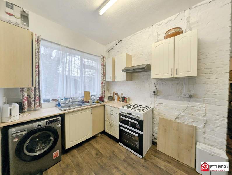 Appointed with wall and base units with work tops over and inset stainless steel sink with mixer tap. Windows to side and rear aspect, plumbing in place for washing machine, radiator and wood-effect laminate flooring.