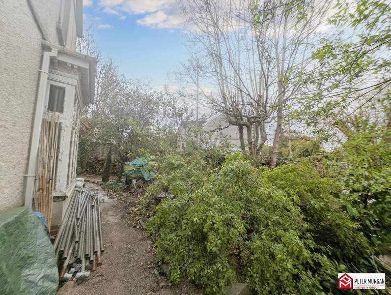 Range of mature trees, bushes & shrubbery with small patio area and side door to kitchen.