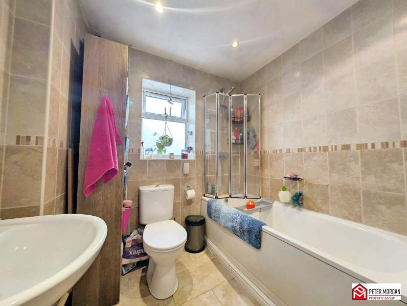 Comprising of a low level WC, wash hand basin, panelled bath with shower over and shower screen. Frosted window to side aspect, fully tiled, inset ceiling spotlight and radiator.