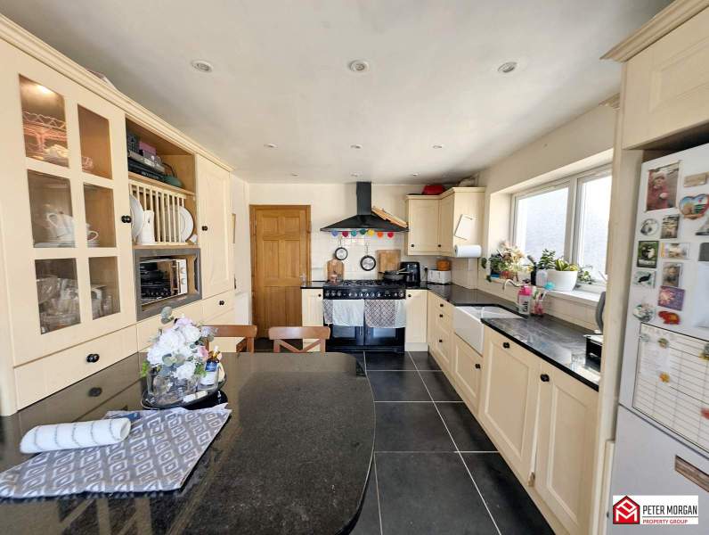 Appointed with a range of matching wall and base units with work tops over and 'Belfast style' composite sink with mixer tap. Windows to side aspect, cooker with 5-ring gas hob & cooker hood, space for fridge/freezer, plumbing in place for washing machine, space for tumble dryer, radiator, tiled flooring and inset ceiling spotlights.