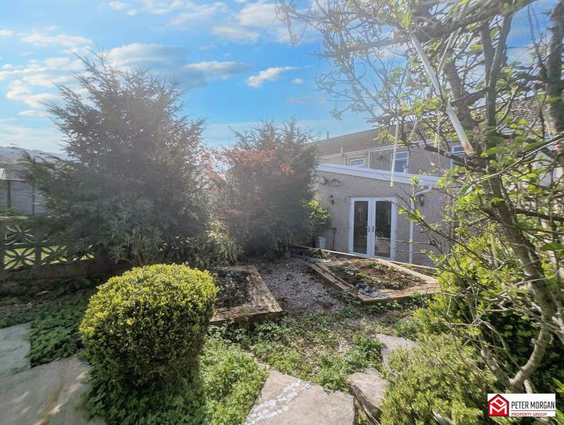 Enclosed rear garden with steps up decorative stone area with variety of trees, bushes & shrubbery, outside tap, external power supply, flagstone patio area, access to workshop to rear and rear access lane.