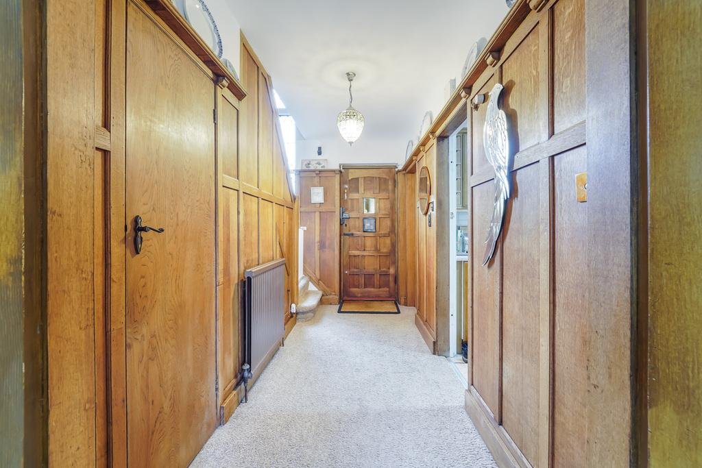 The welcoming entrance hall features original wood panelling and sets the tone for the home’s retained period charm.