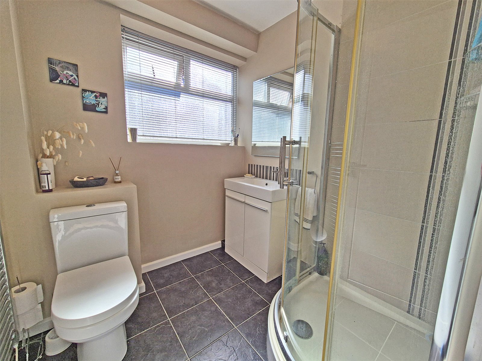 Comprising inset wash hand basin with mixer tap with storage cupboard below, low level w.c, corner tiled shower cubicle with Mira shower over, chrome ladder heated towel rail, tiled flooring, obscure double glazed window overlooking side aspect.
