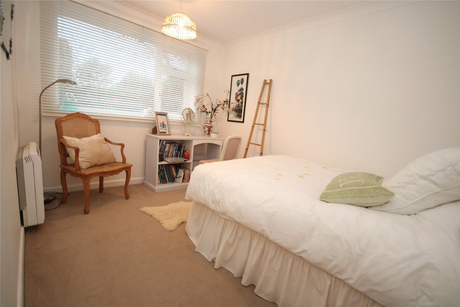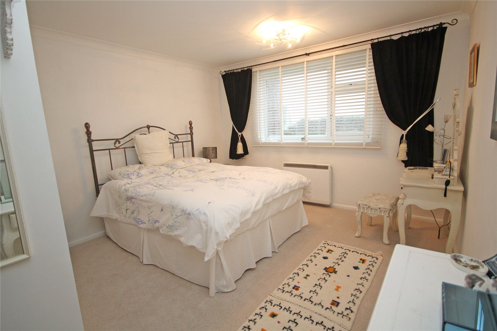 Electric storage heater, double glazed window overlooking side aspect.
