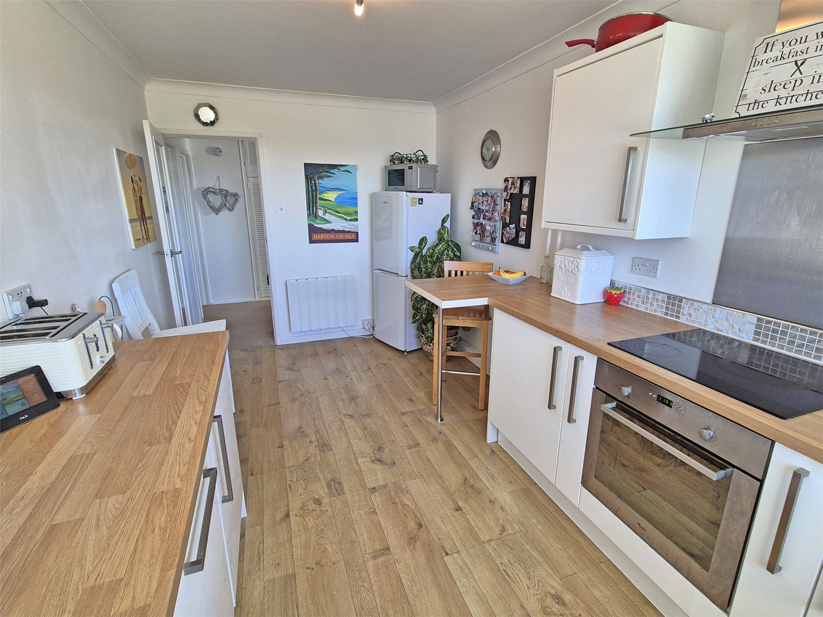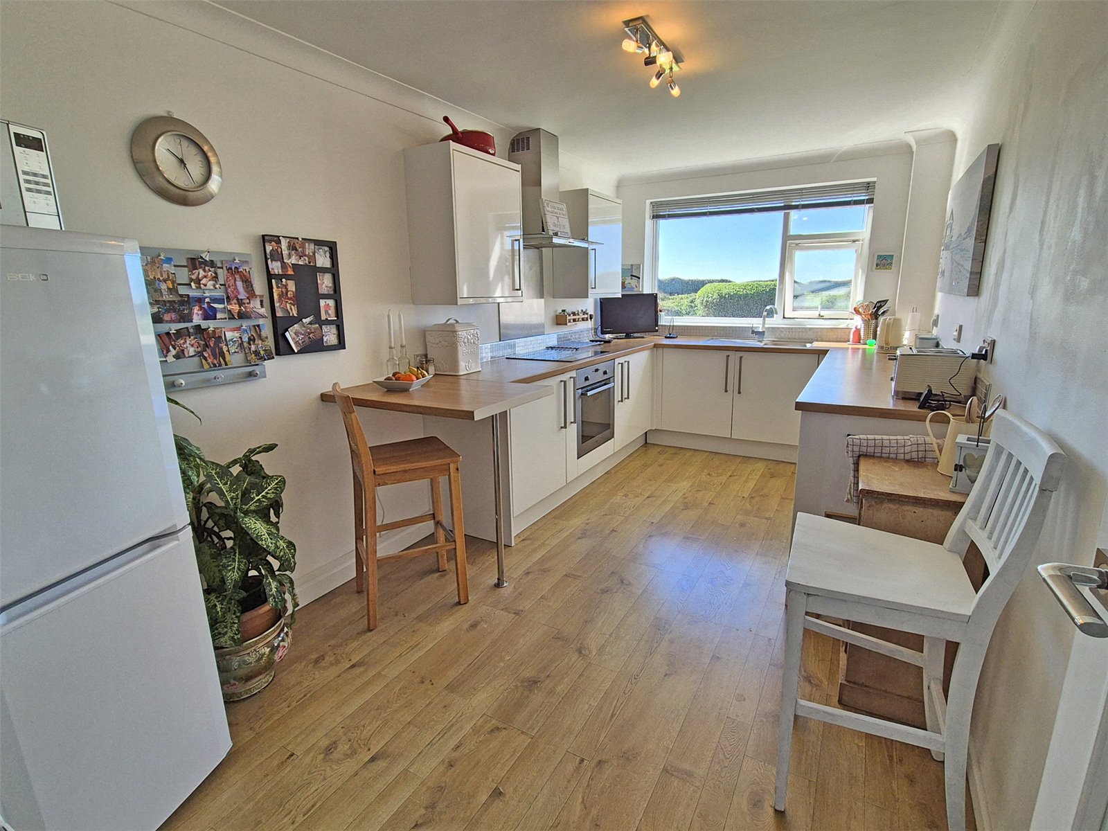 Comprising single bowl single drainer sink unit with mixer tap, range of worksurfaces with draws and cupboards below, inset electric hob with extractor over and built in oven/grill below, integrated dishwasher and built in washing machine, two matching wall mounted units, space for upright fridge freezer, electric heater, double glazed window overlooking front aspect with sea view.