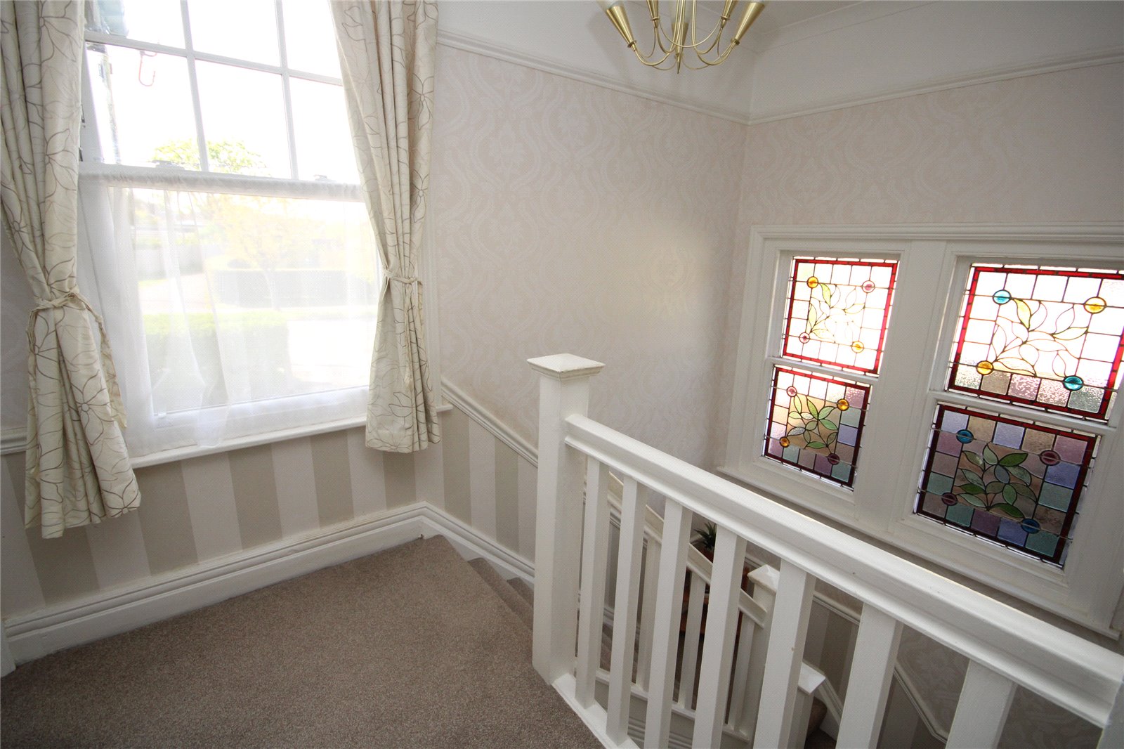 Stained glass windows, hatch to loft space with ladder providing excellent storage, built in shelved linen cupboard, further window to front.