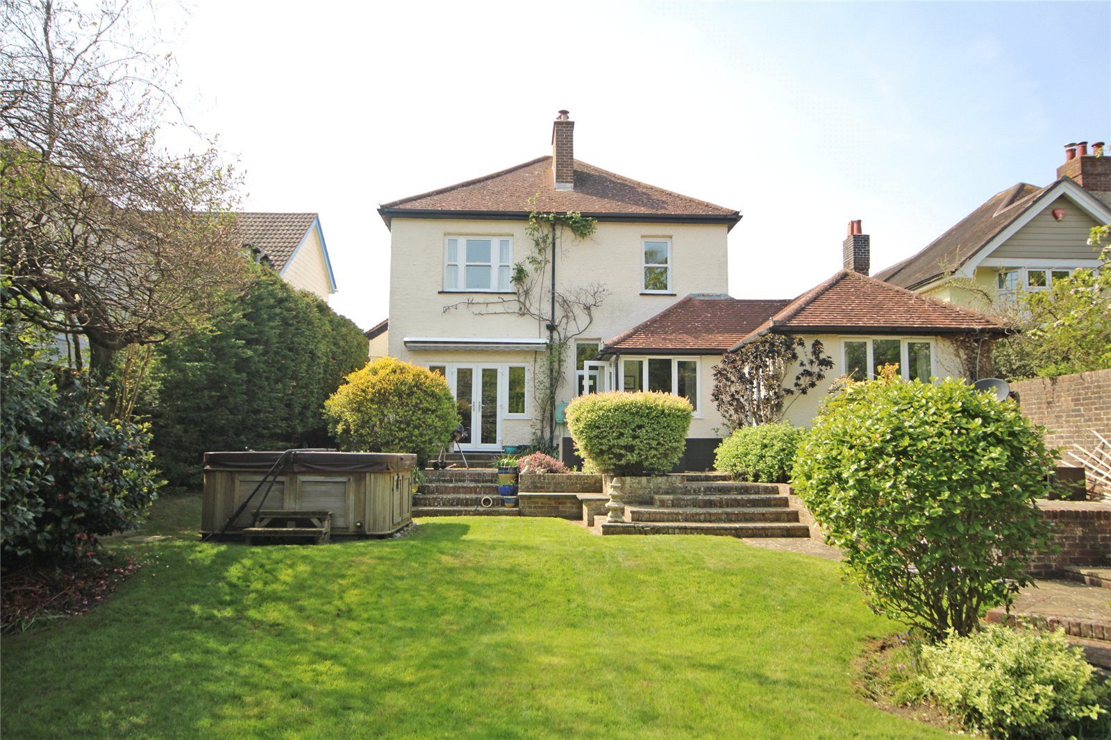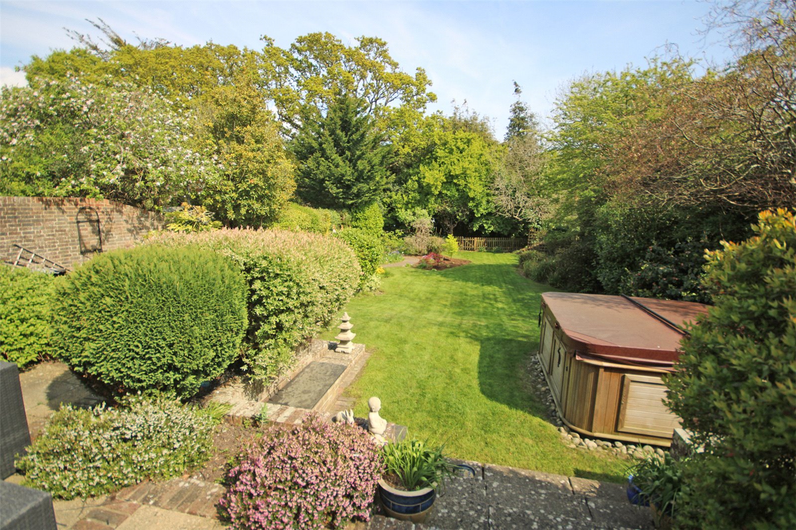 The property has the benefit of good sized rear gardens with paved patio terrace with sun blind immediately adjacent to the property with steps leading to lawned gardens, interspersed with mature shrub and flower borders. The gardens are well enclosed by mature shrubs and hedging, providing a lovely backdrop. Side pedestrian gate.