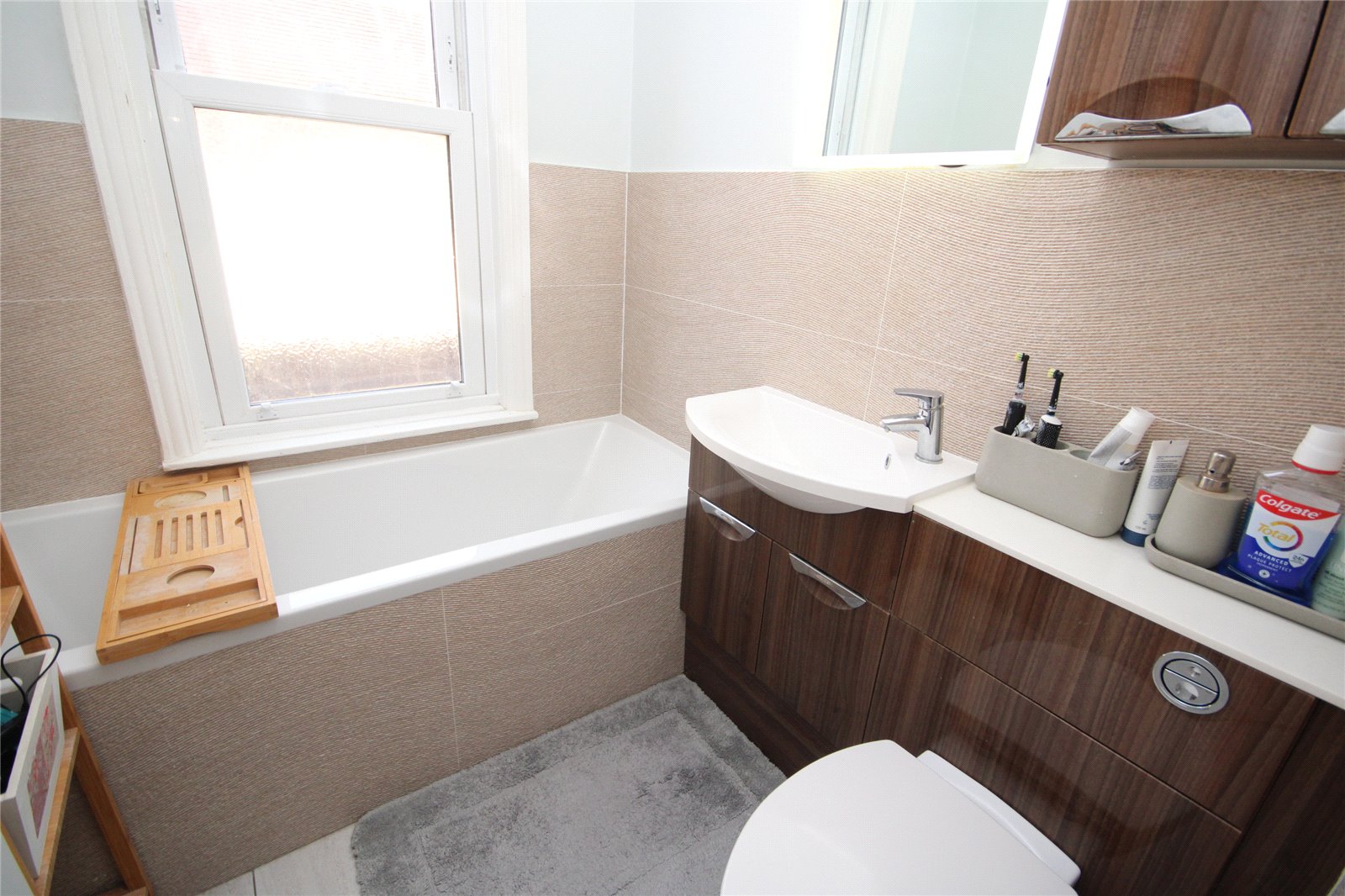 Being part tiled comprising inset wash hand basin with mixer tap, low level w.c., bath with mixer taps, tiled flooring, window to side.