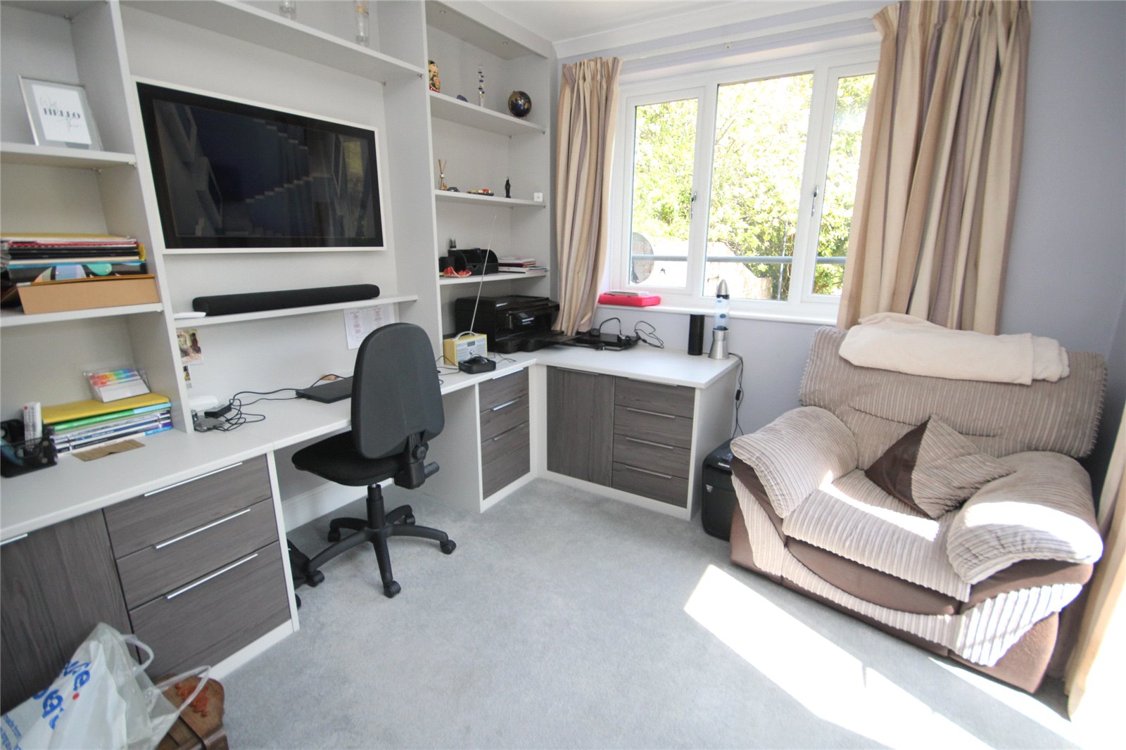 Range of fitted furniture incorporating computer station with range of drawers and cupboards below, further shelving over, window and double opening doors to the garden.
