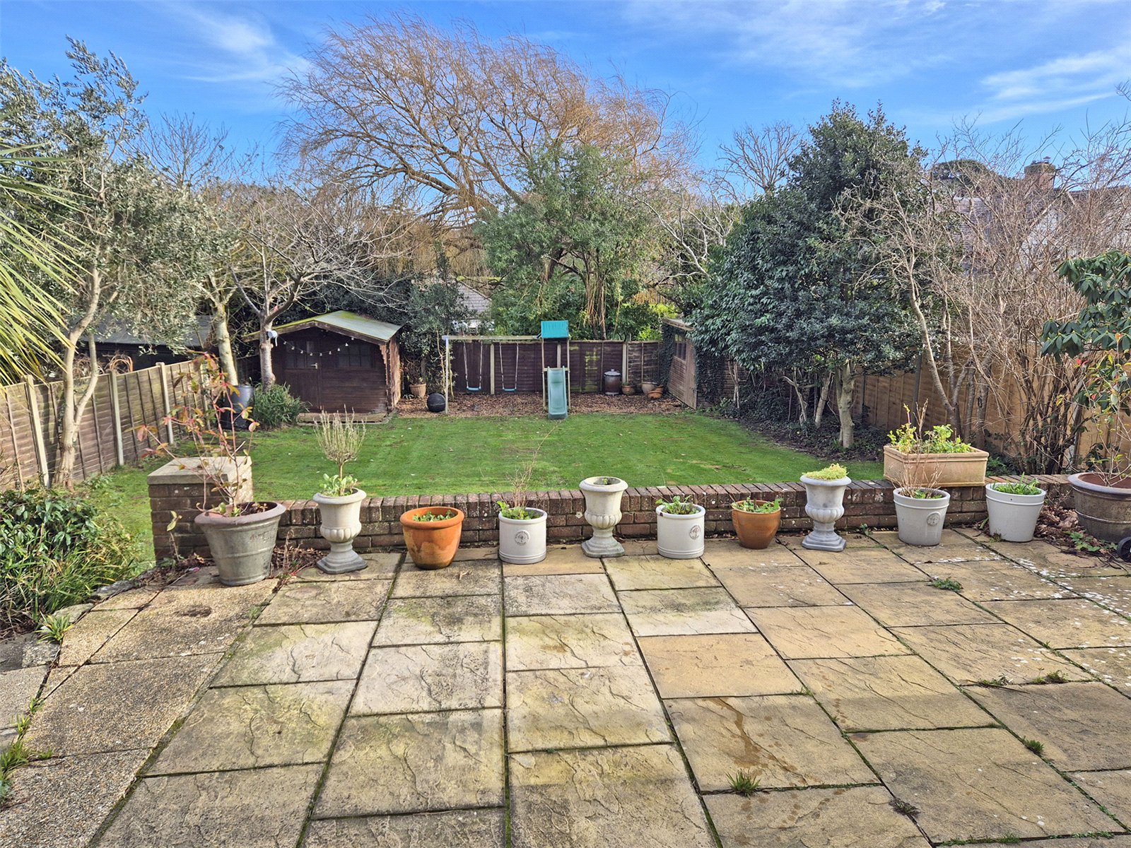 with raised patio terrace providing a lovely sitting out area with steps leading to lawned established gardens, well enclosed by fencing with mature shrubbery. Two timber garden sheds/stores. Side pedestrian access.