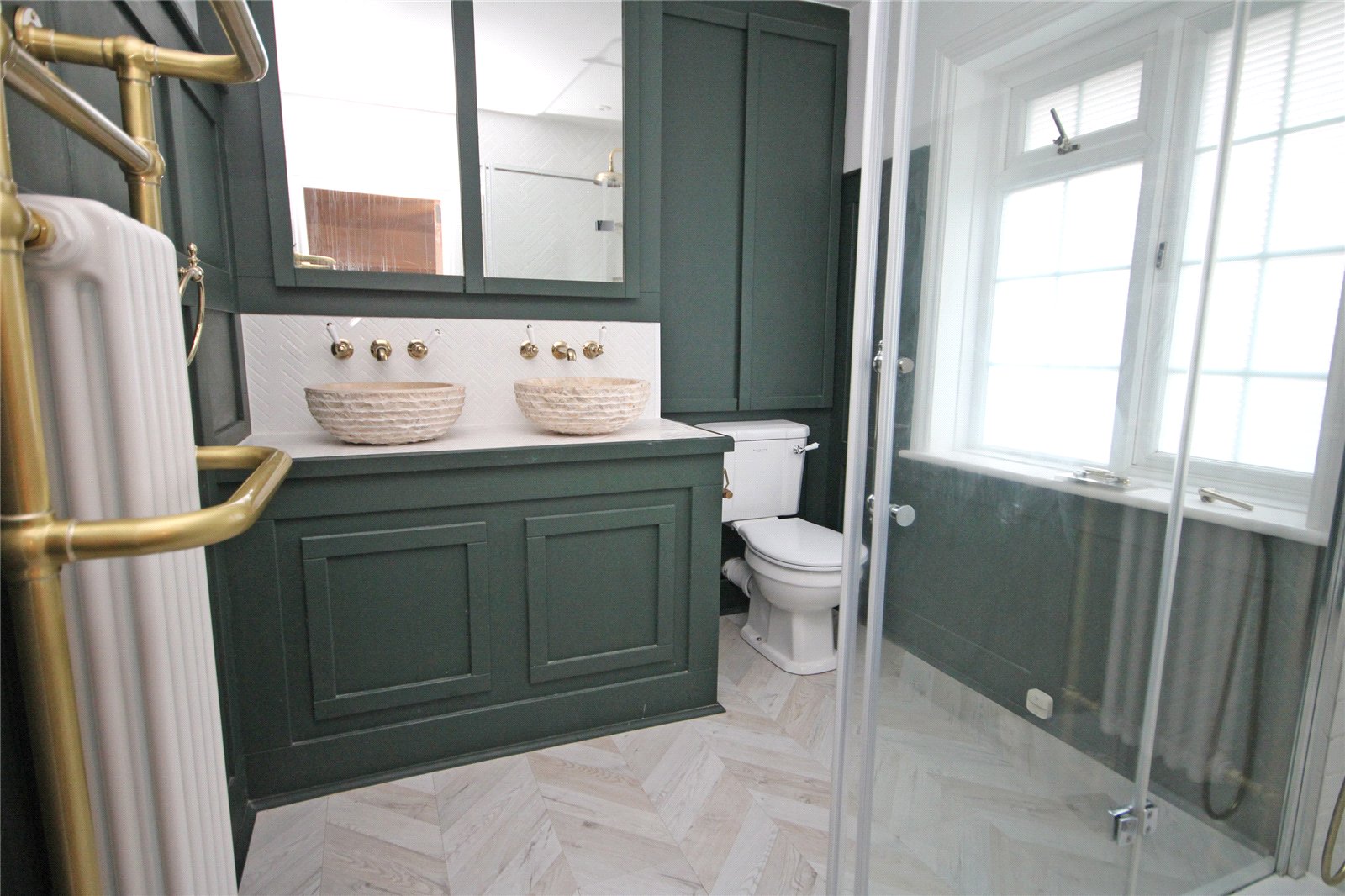 Being well fitted comprising twin bowl sink units with mixer taps, low level w.c., good sized tiled shower cubicle with fixed head shower over and further hand held attachment, heated radiator and towel rail, additional storage/shelving, window to front.