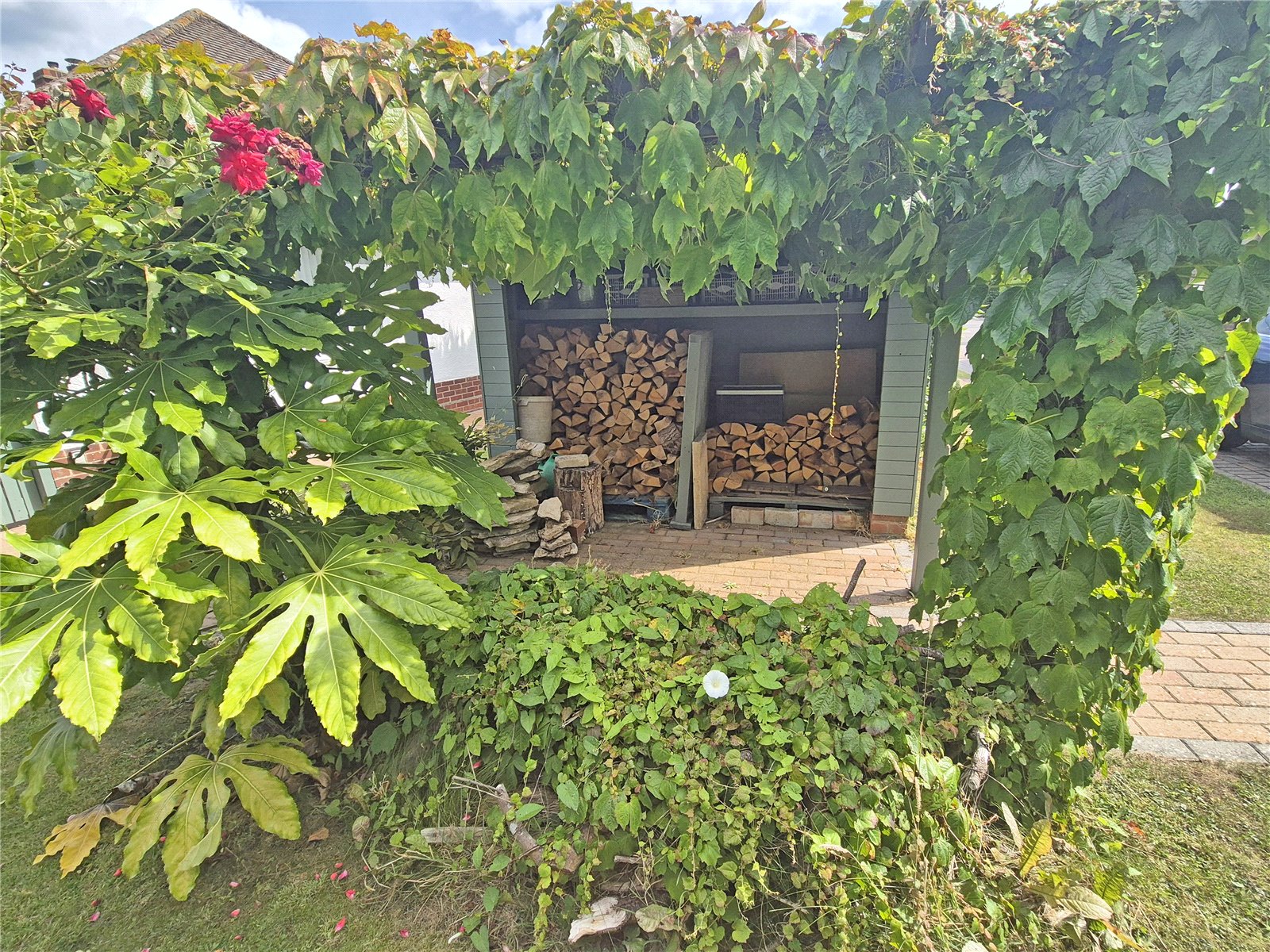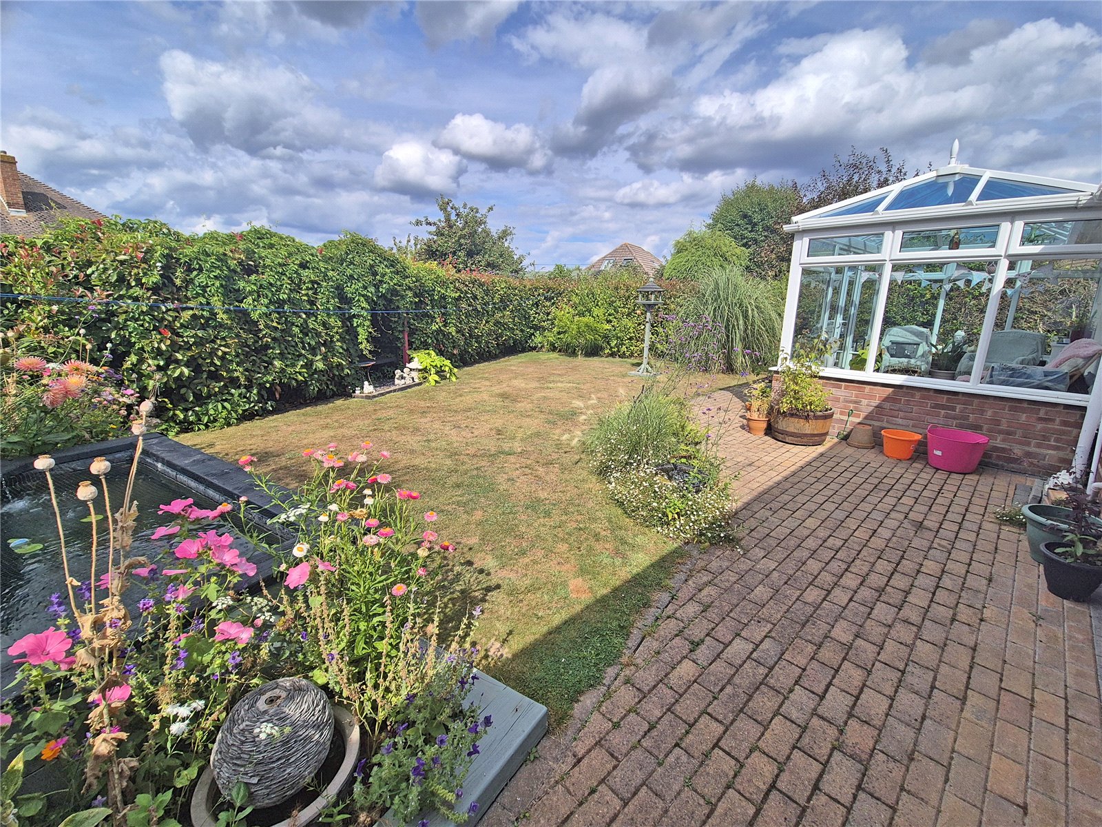 with area of paved patio leading onto shaped level lawn, space for garden pond with water feature, all benefiting from an excellent degree of privacy, being enclosed by fencing and hedging. There is a further storage area to the side.