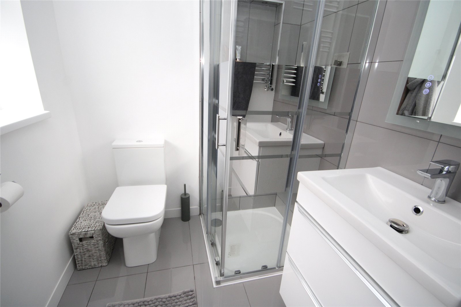 Comprising inset wash hand basin with mixer tap, two soft close drawers below, low level w.c., tiled shower cubicle with fixed head shower over and further hand held attachment, tiled flooring, underfloor heating, heated towel rail, window to side.