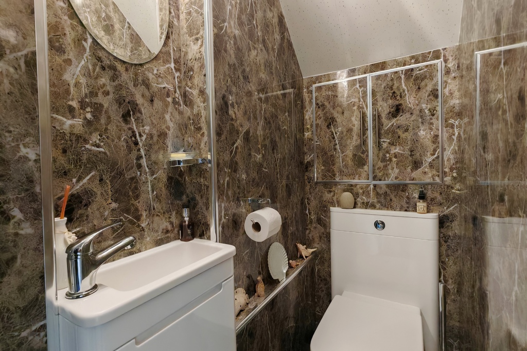 with uPVC double glazed frosted window to side, airing cupboard with radiator and shelving, loft hatch