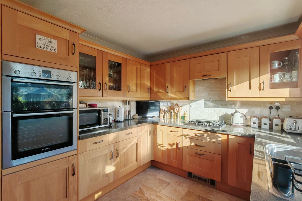with tiled flooring, a selection of high and low level kitchen cabinets, stone effect laminate worktops, integrated double oven, localised tiling, four ring gas hob with extractor fan over and glass splashback, one and a half bowl stainless steel sink with mixer taps over, uPVC double glazed window overlooking rear garden, integrated dishwasher, space and plumbing for washing machine, space for tall fridge freezer, uPVC double glazed door leading to rear garden