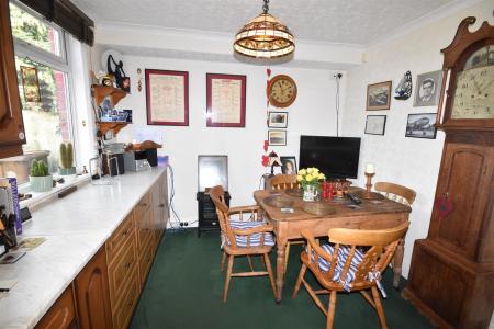 L shaped room, space for dining table, two uPVC double glazed windows to rear elevation. Double panelled radiator and part tilled walls. Range of fitted kitchen units include base cupboards and draws, working surfaces over, inset stainless steel 1.5 bowl sink and drainer with mixer tap, tilling to splashbacks, wall mounted eye level cupboards, extractor fan, plumbing and space for a dishwasher. Integral appliances include an electric oven and AEG electric hob, wooden part glazed rear entrance door leading to conservatory.