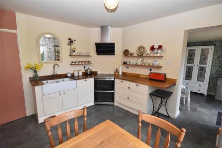 Dining Kitchen - 3.76m x 3.40m (12'4 x 11'2) - Radiator, sliding uPVC double glazed patio door to rear elevation connecting to the patio terrace and rear garden and views over the surrounding countryside. Space for a dining table, range of fitted Shaker design bespoke made solid wood kitchen units comprise base cupboards and drawers including deep pan drawers, hand made wood block working surfaces over, twin Belfast sinks with mixer tap. Integral pull out bin, wall mounted wooden shelving. Open plan to: