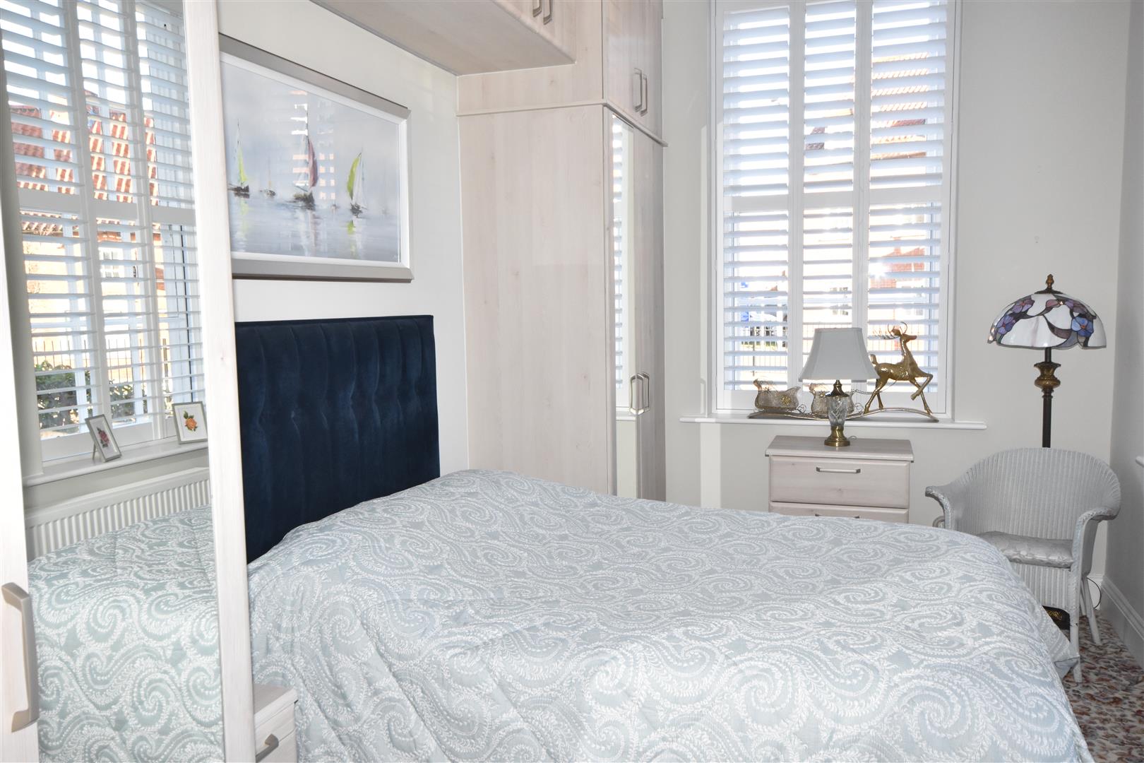 Bedroom - 4.47m x 2.77m ( 14'8 x 9'1) - Three single glazed wood framed raised windows with built in shutter, carpeted flooring and double radiator. Hammond fitted two double built in wardrobes with matching wall storage units, two matching bedside table and separate built in single wardrobe.