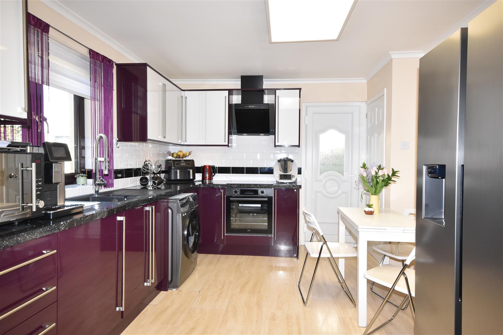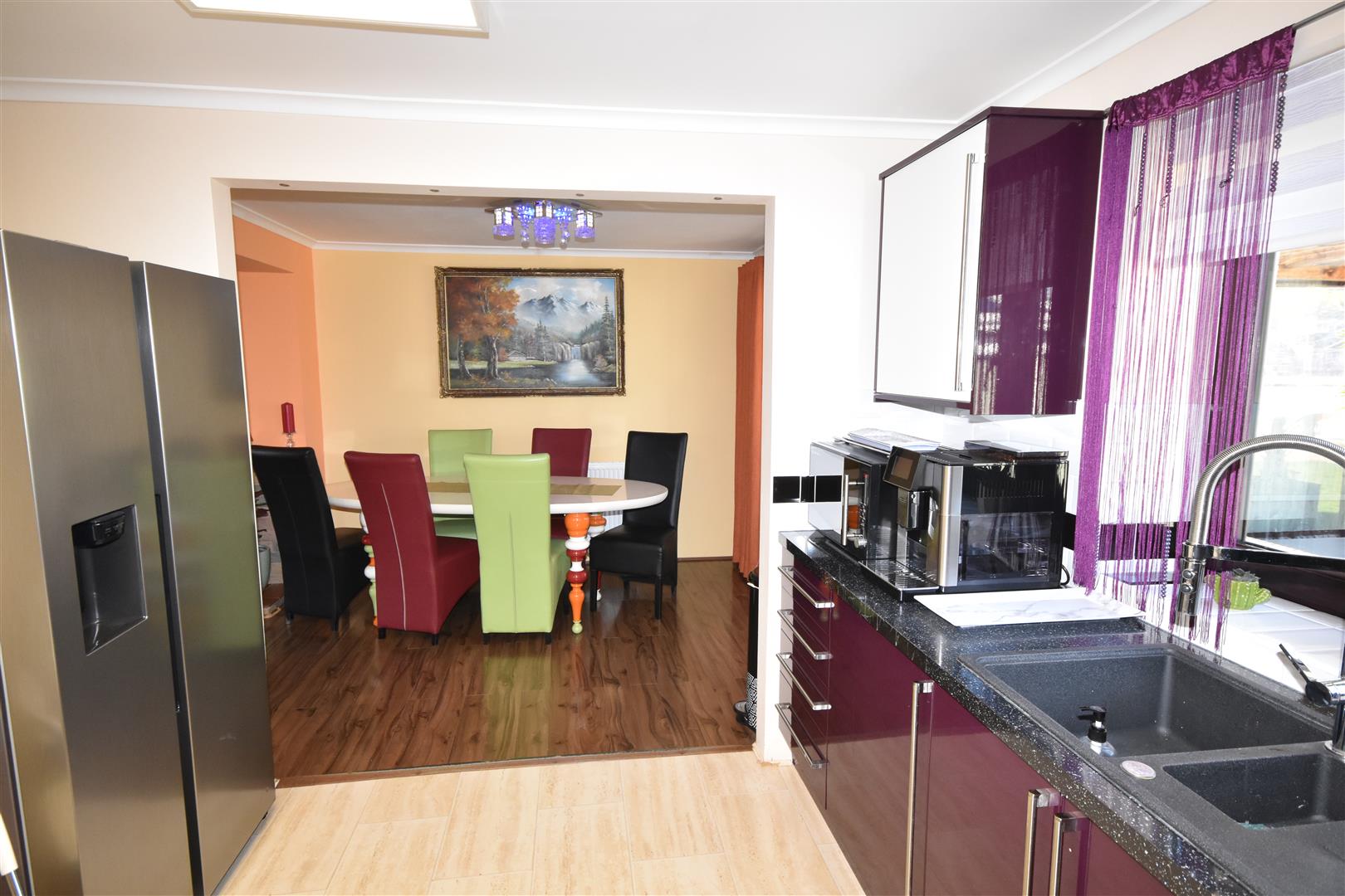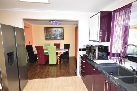 Kitchen - 3.56m x 3.12m (11'8 x 10'3) - Useful store cupboard below stairs, radiator. Laminate floor covering, uPVC double glazed window to rear elevation and side entrance door leading to driveway. Range of quality Howden's kitchen units including base cupboard and drawers, working surfaces above. Inset composite one and a half bowl sink and drainer with mixer tap. Retro-style tiling to splashbacks. Eye level wall mounted cupboards. Fitted appliances include Beko electric oven, Lamona electric hob and dishwasher. Extractor fan, plumbing and space for automatic washing machine. Space for a small table and chairs. Open plan through to the dining room.