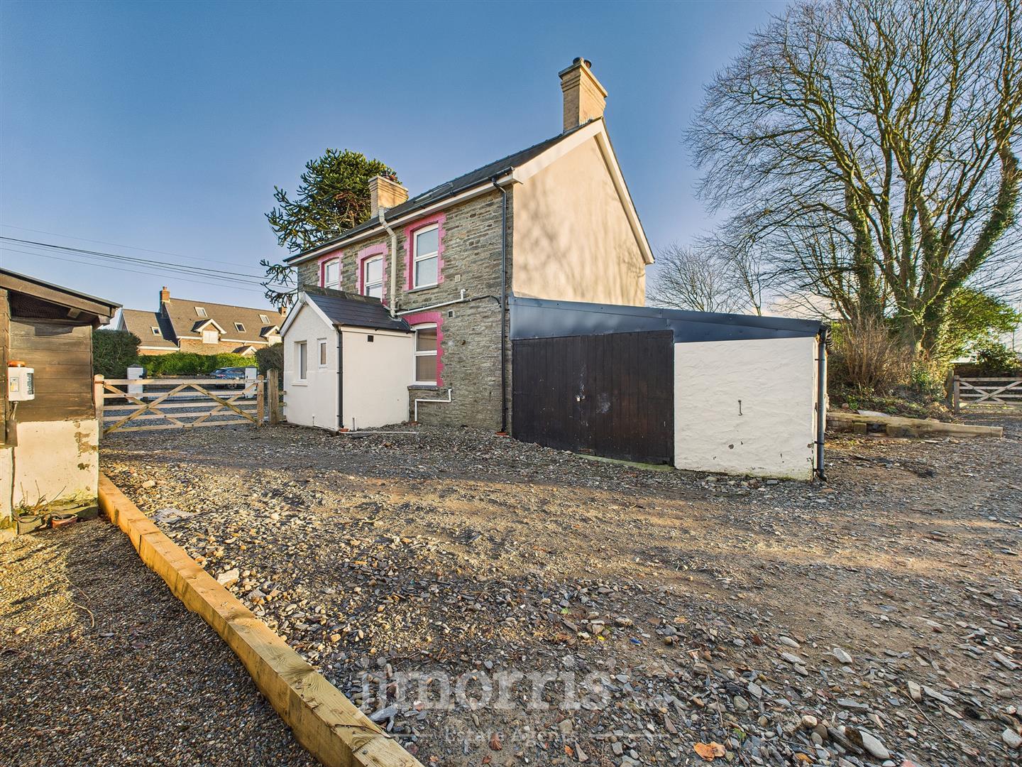 Externally - The property is approached via a gated entrance leading onto a gravel pathway and onward to a paved patio at the front door. To the front are well-maintained lawned areas. The property is surrounded by mature shrubs, bushes, and trees, offering a high degree of privacy. To the rear, there is a further gated entrance providing ample off-road parking for several vehicles, along with space for turning. There is access to the garage and useful outbuildings. Further gated small Paddock area to the rear. Small outhouse with electric and water which was the old laundry room as well a wooden shed.