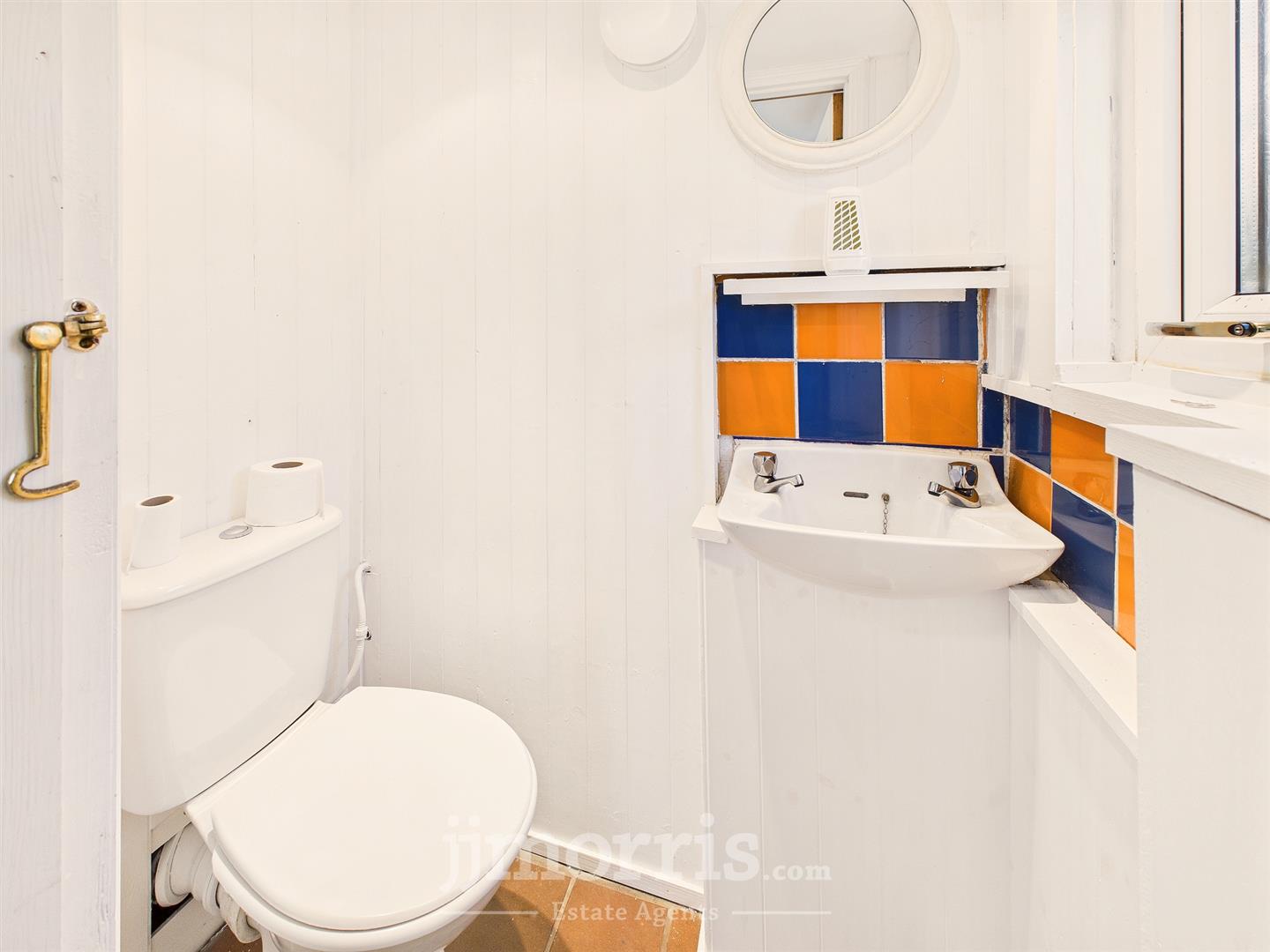 Wc - Low flush WC, Wash basin, Double glazed Upvc window, part tiled walls, part wooden panel walls, extraction fan, tiled flooring, spot lights