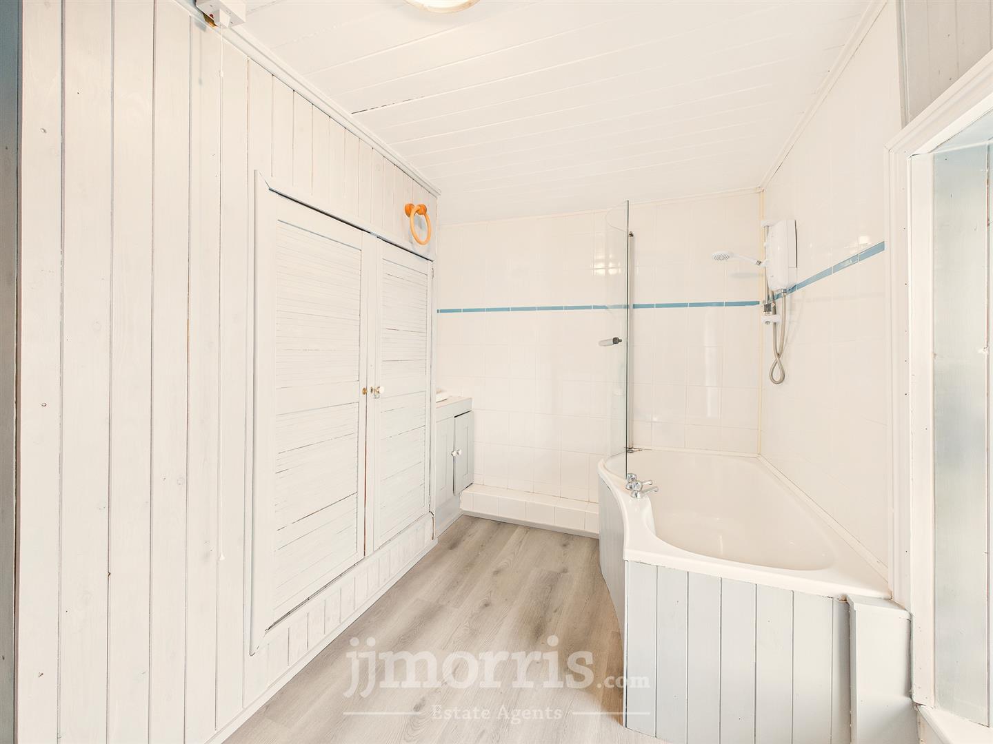 Bathroom - Low flush WC, P-Shaped bath with screen and electric shower, vanity unit with wash basin, double glazed Upvc window, part tiled walls, part wooden panel walls, wooden panel ceilings, built in airing cupboard, radiator, wooden effect flooring.