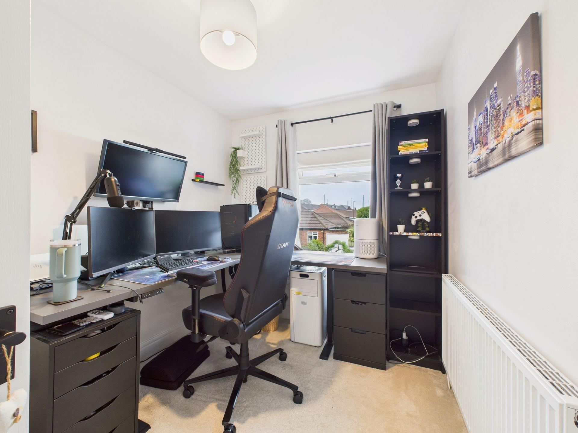 To the first floor, the property offers three well-presented bedrooms. The main bedroom is positioned to the front and features a square bay window along with a range of modern fitted wardrobes. The second double bedroom also benefits from two sets of built-in wardrobes, offering excellent storage solutions. The third bedroom is ideal as a child’s room, home office or guest room. A stunning family bathroom completes the first-floor layout, with modern fittings and a stylish design.
