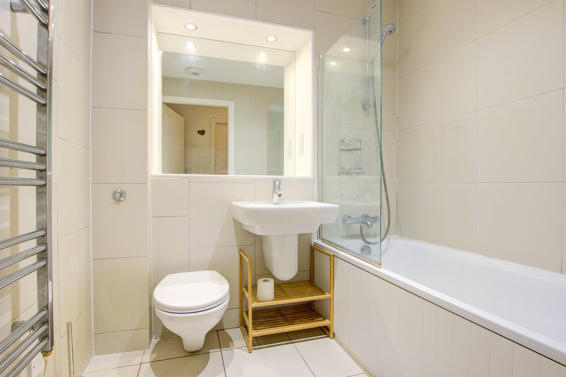 White suite comprising; bath with overhead shower, wall-mounted basin, WC, central heated towel rail, tiled walls & floor inset shelf with mirror.
