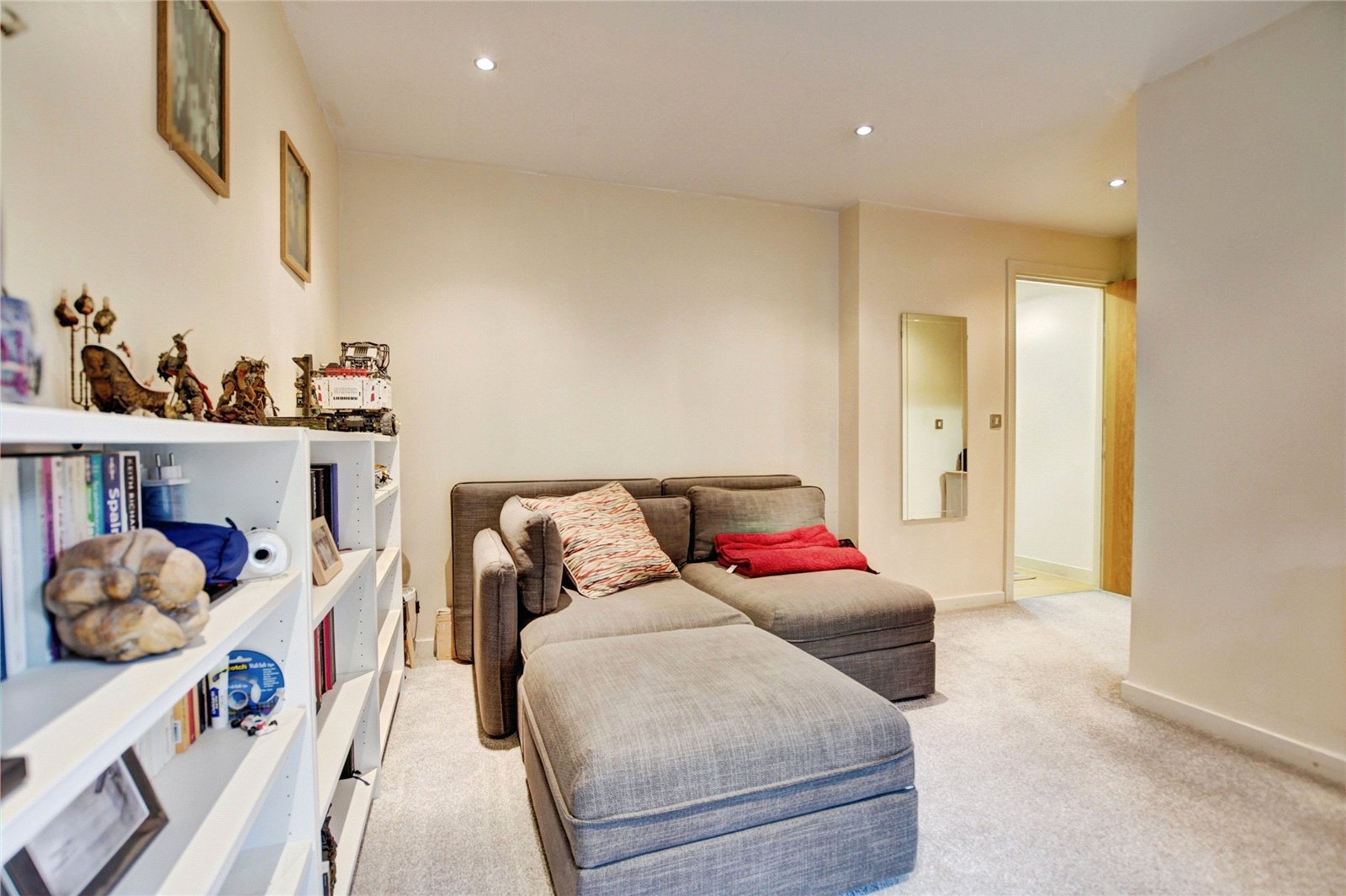 Storage cupboard housing hot water cylinder, entry phone system, ceiling spotlights.