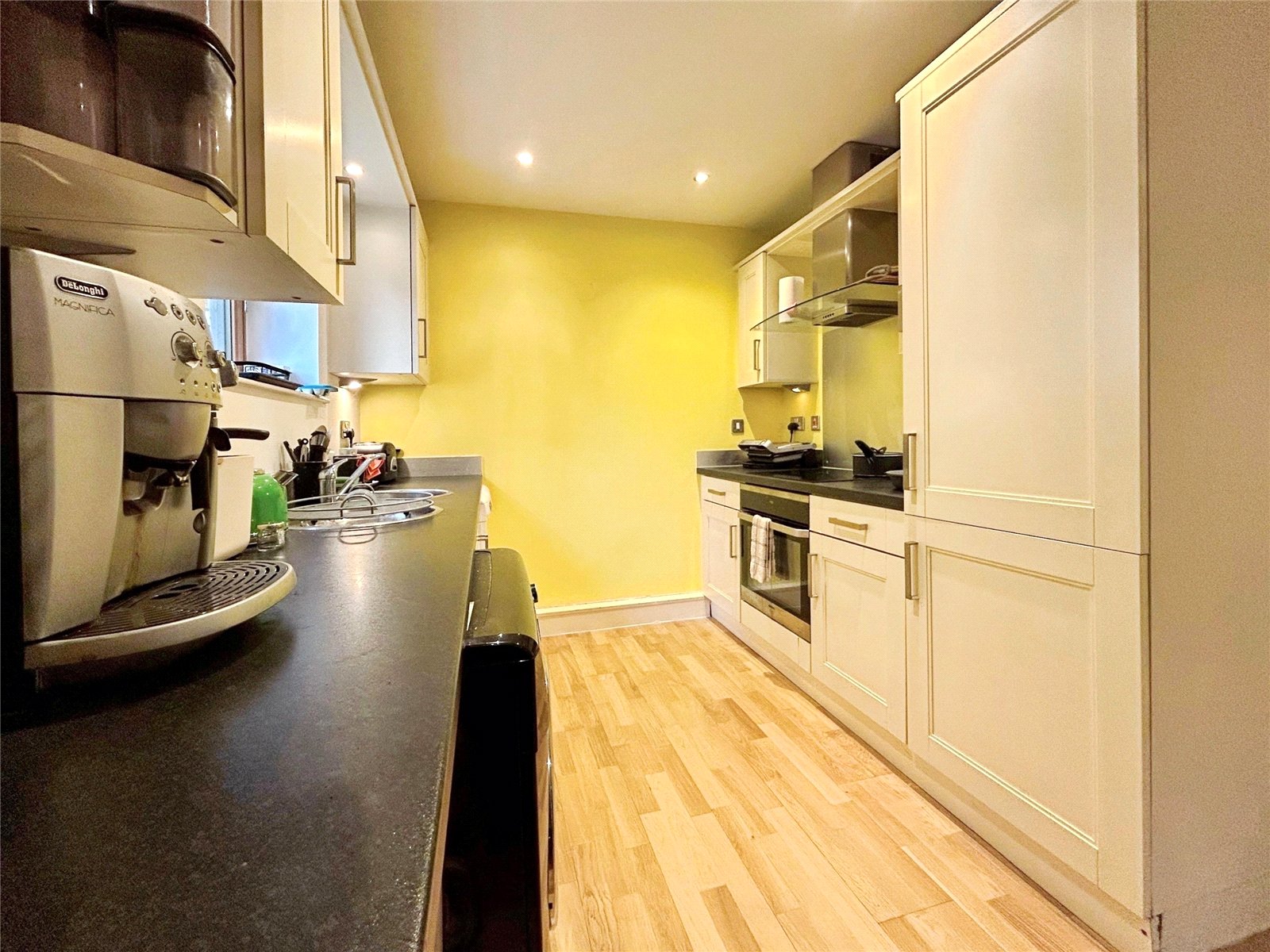 Range of wall and base units with work surfaces incorporating; circular stainless steel sink unit and drainer with mixer tap, electric oven and hob with extractor fan above, built in fridge/freezer, space for dishwasher and washing machine, double glazed window, ceiling spotlights.