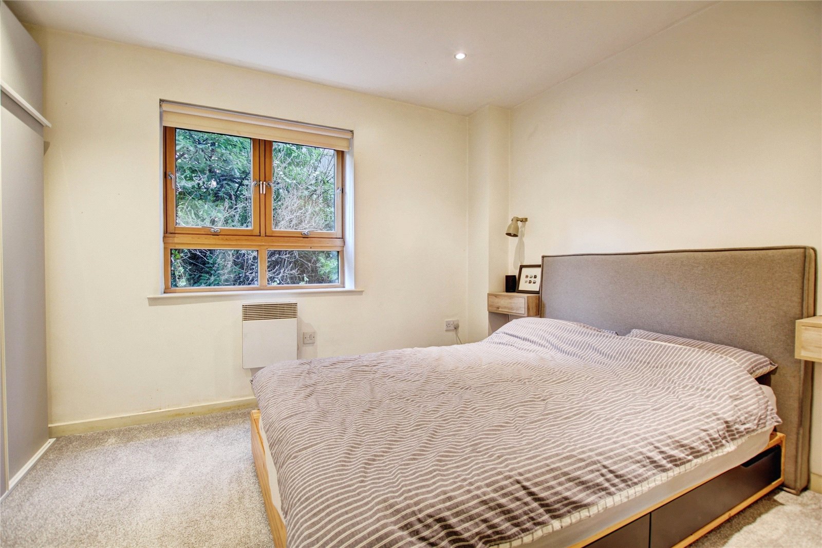 Double glazed window, wall mounted electric heater, ceiling spotlights.