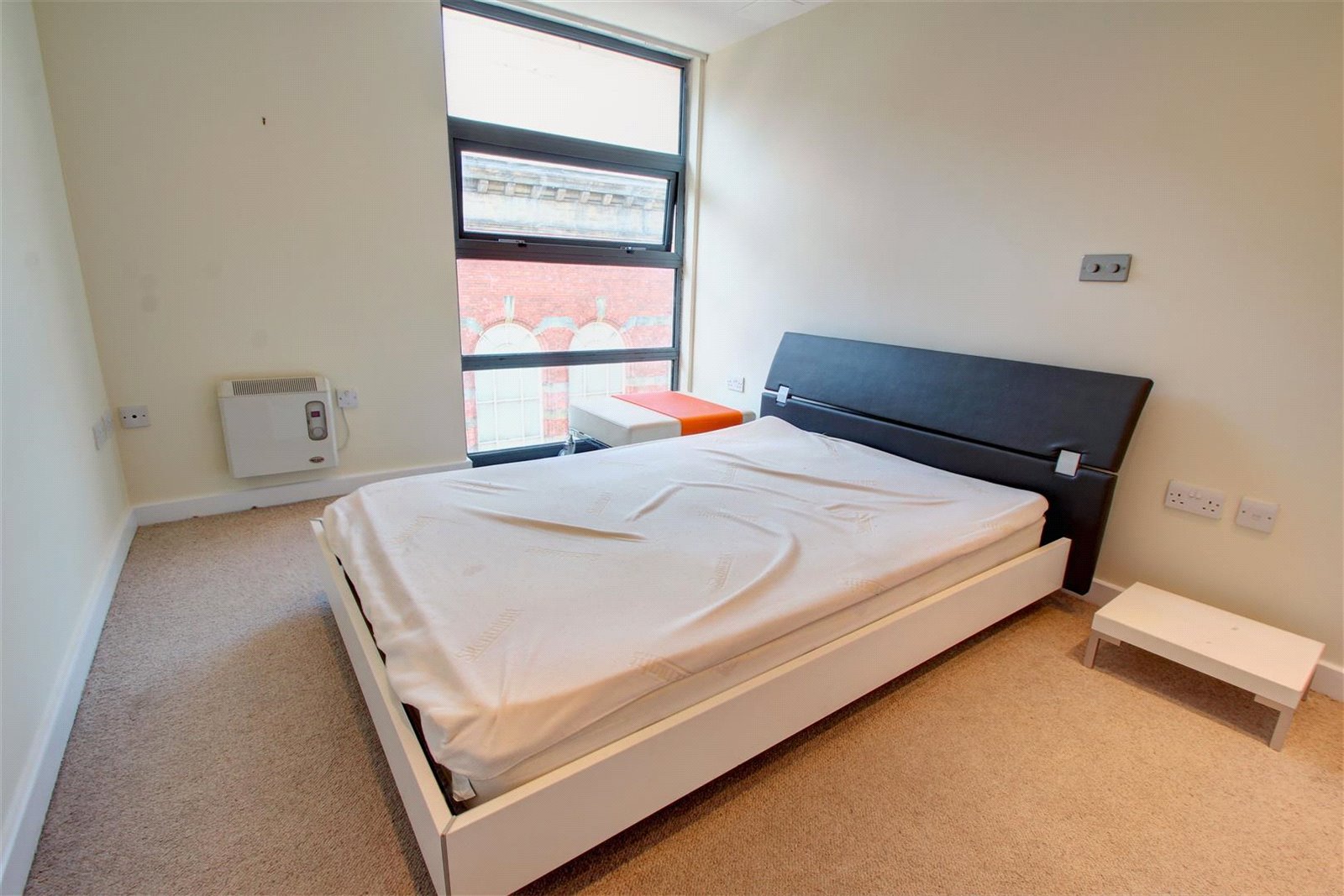 Double glazed window, wall mounted electric heater, telephone point, ceiling spotlights.